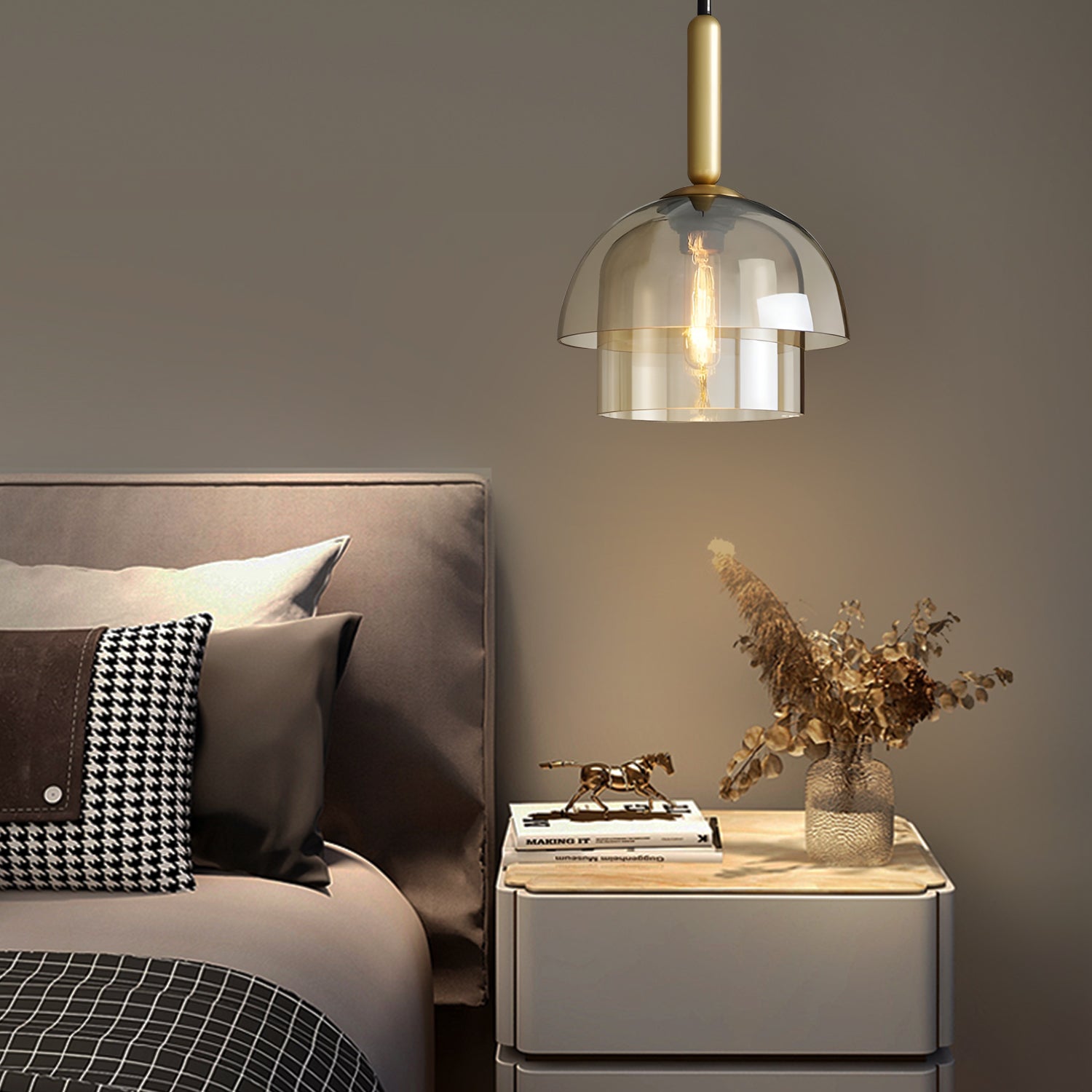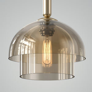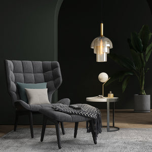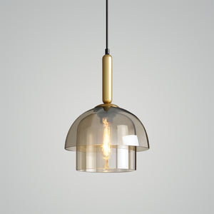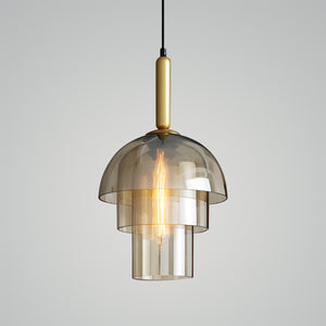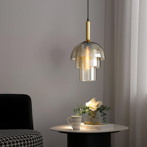 Illuminate your living space with the "Jolly Pendant Lamp," a masterpiece of lighting that combines layered beauty with a warm, inviting ambience. This pendant features a series of tiered glass shades that elegantly cascade light, creating a soft diffusion that is both soothing and mesmerizing. The uppermost layer boasts a subtle golden hue, adding a touch of opulence to its sophisticated design. The slim, black cord contrasts sharply with the rich brass accents, culminating in a modern fixture that exudes timeless charm. Perfect for hanging above a dining room table or in a lofty foyer, the "Strata Glow Pendant" is sure to become a conversation piece, offering a unique blend of artful design and cozy illumination.