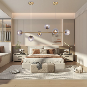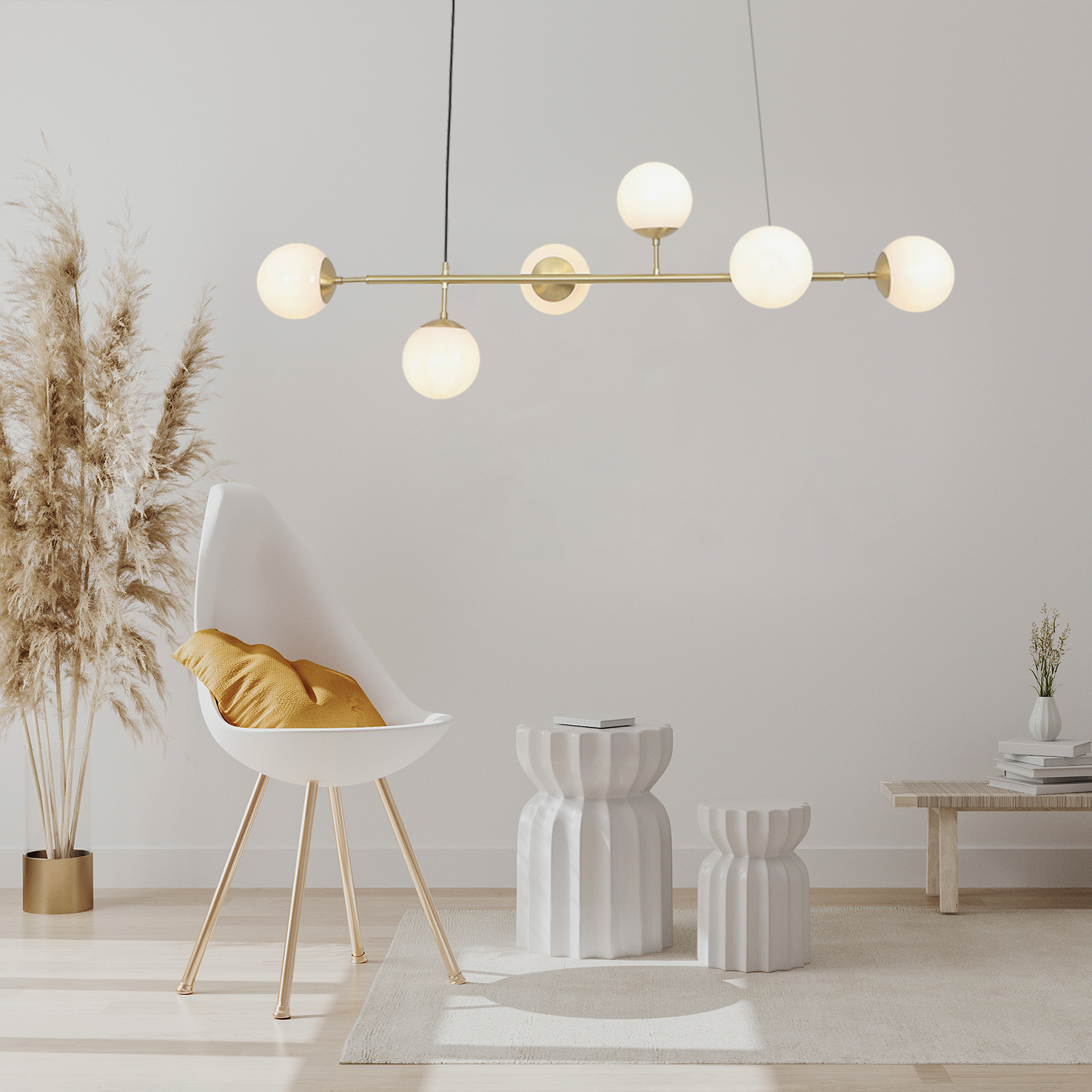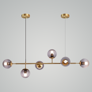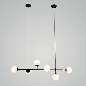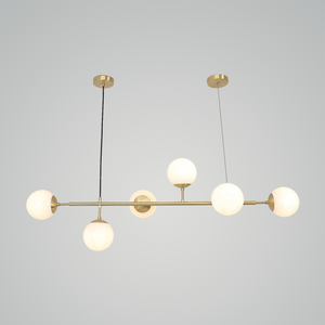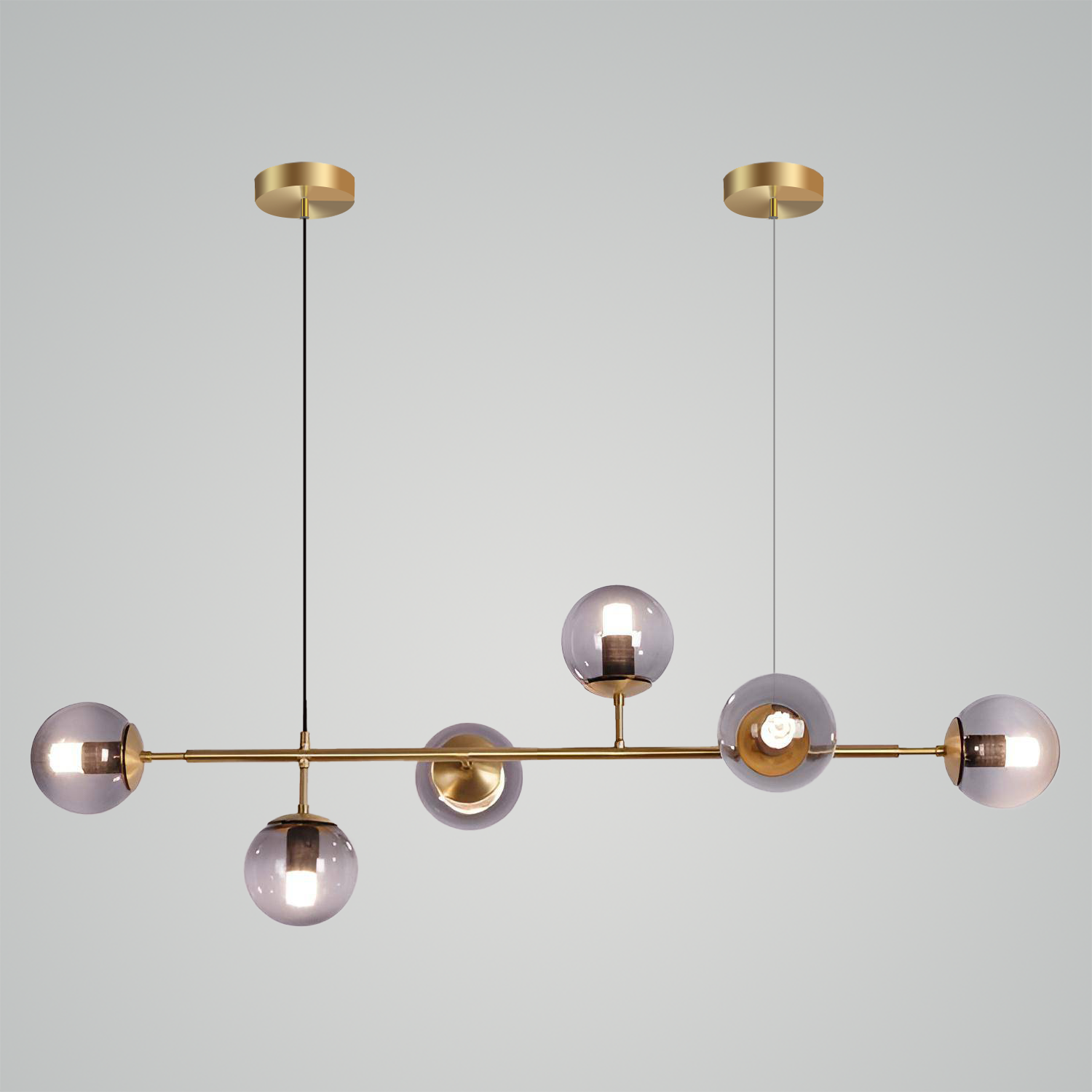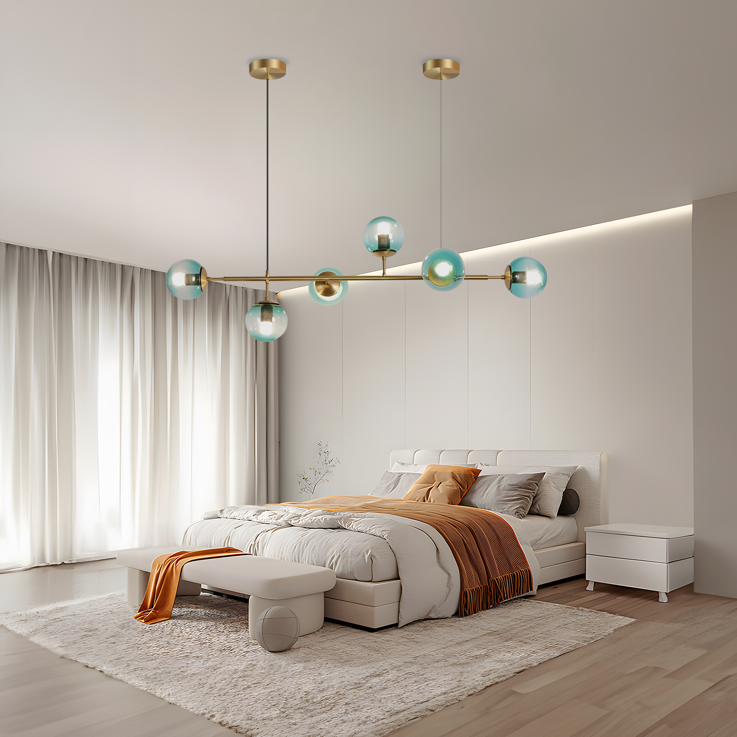 Immerse yourself in the sophisticated aura of the Celestial Spheres Linear Pendant light, where modern design meets timeless elegance. This stunning piece features an array of glass orbs delicately balanced on a slender golden rod, reflecting a constellation of lights in your space. Each orb offers a different shade of reflective glass, casting a unique glow and creating an intriguing play of light and shadow. Ideal for those who appreciate the art of design and the nuance of light, this pendant light makes a bold statement in any room. Elevate your living area or dining room with the Celestial Spheres Linear Pendant light, a true masterpiece of lighting.