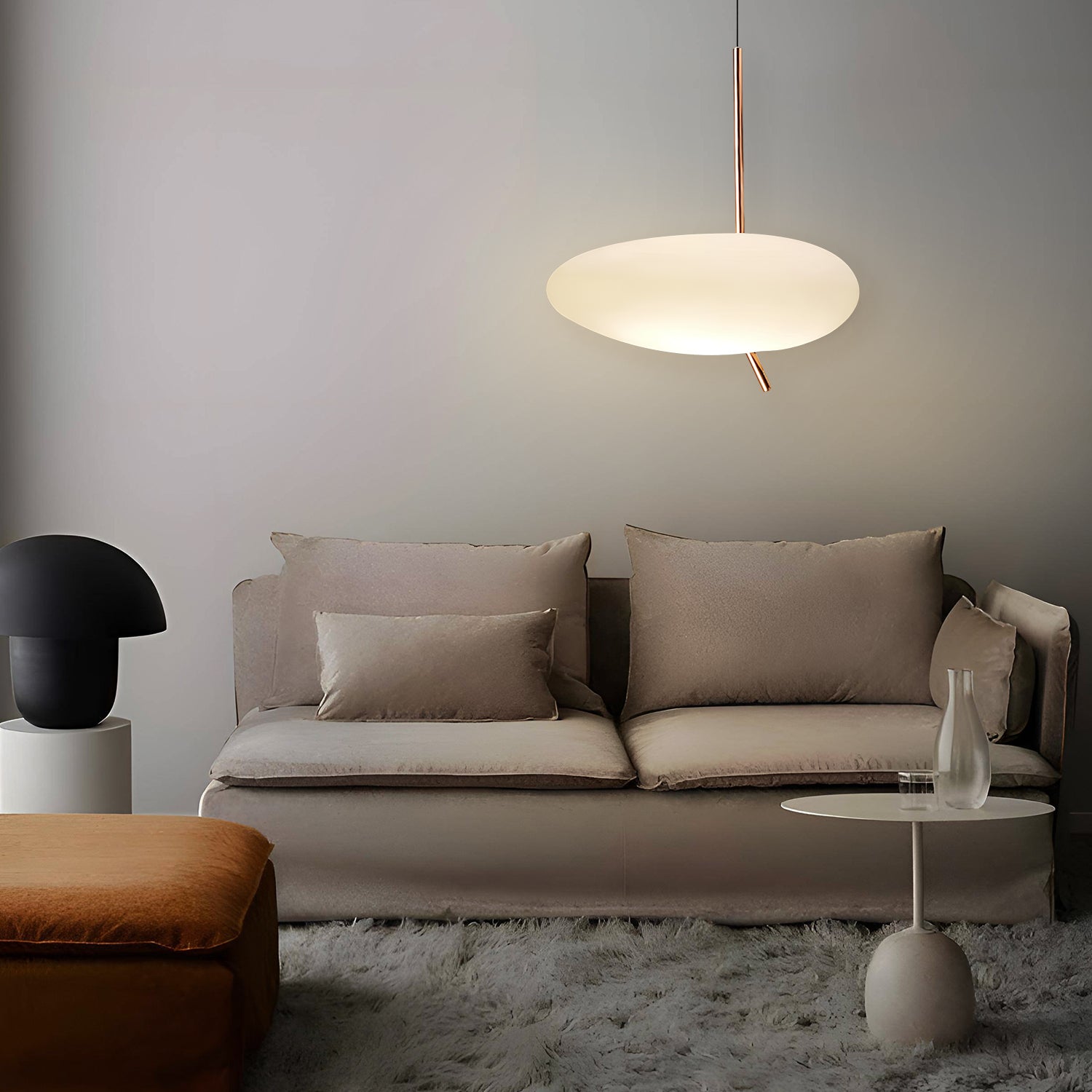 Float into the ethereal with the "Pebbles Pendant Light," a set of lights that captures the tranquil essence of a serene sky. Each pendant boasts a milky white glass shade that mimics the soft, rounded stones smoothed over by time, emitting a warm, diffused light that gently illuminates your space. The elegant brass fittings provide a modern contrast to the cloud-like pendants, offering a sleek and sophisticated touch. Arranged in a harmonious trio, these lights are perfect for creating a focal point in a living room, hovering over a dining table, or adding a soft glow to a welcoming foyer. The Celestial Cloud Pendant Trio brings a peaceful ambiance to any interior, inviting a sense of calm and introspection.