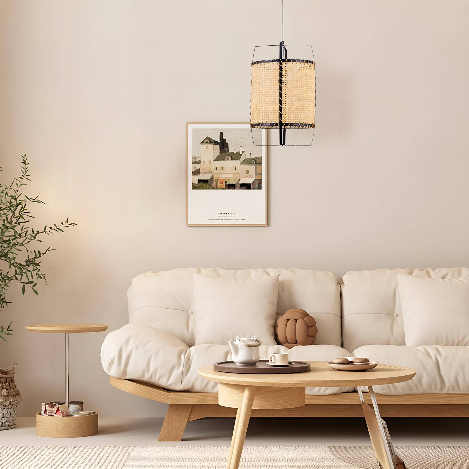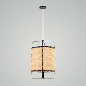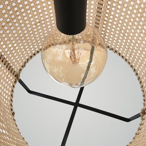Discover the natural elegance of the 'Rattan Cane Pendant Light,' a luminary that marries organic materials with geometric design. This pendant light features a meticulously woven rattan shade, held within a sleek black metal frame, creating a striking contrast and a warm, diffused glow. Crafted for those who seek to bring a piece of nature into their home decor, this pendant light is perfect for settings that call for a touch of rustic yet refined beauty. Illuminate your space with a cozy, inviting ambiance with this unique rattan cage pendant light, suitable for living spaces, dining areas, or any corner that could use a whisper of natural charm.