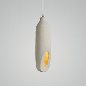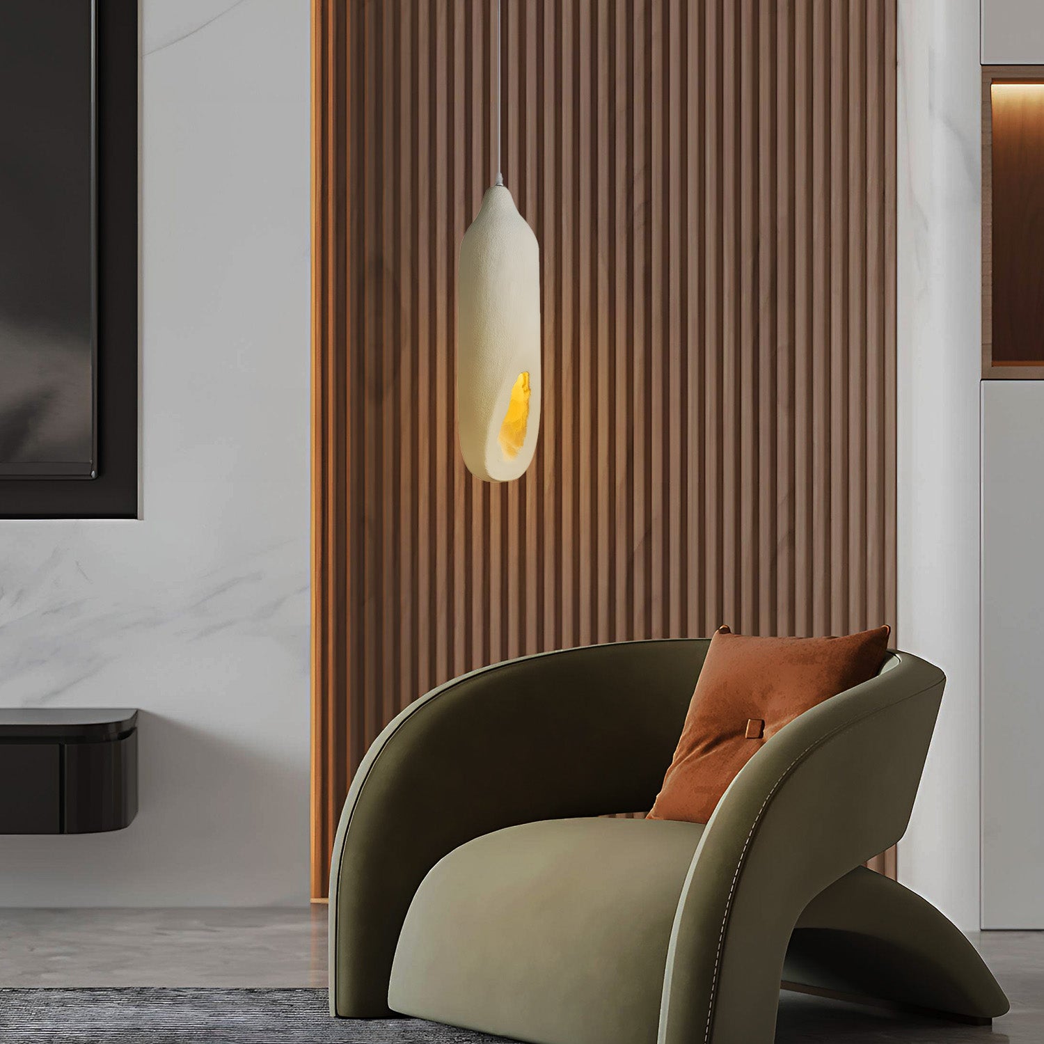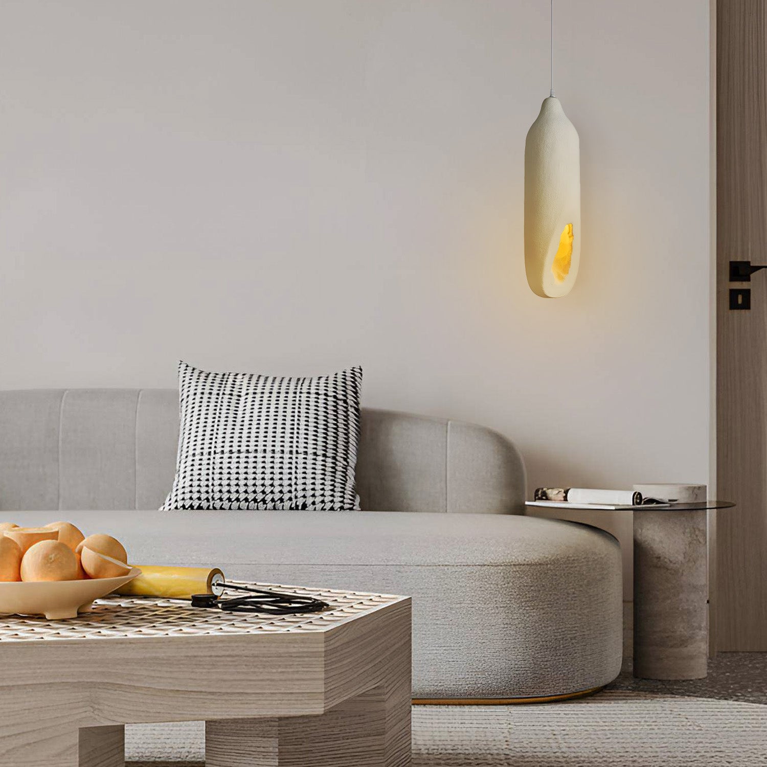 Introducing the "Seltanica Pendant Light," where artistry meets natural inspiration. This pendant light captures the wabi-sabi spirit of beauty in simplicity and impermanence. Designed to emulate the organic form of a cocoon, its unique texture and the gentle golden glow peering through the opening offer a touch of nature's tranquility to your living space. Each lamp is a statement piece, promising to bathe your room in a soft, inviting light, creating a peaceful haven in the hustle and bustle of daily life. It's not just lighting; it's an experience of calming beauty, perfect for those who seek a subtle yet striking element in their decor.