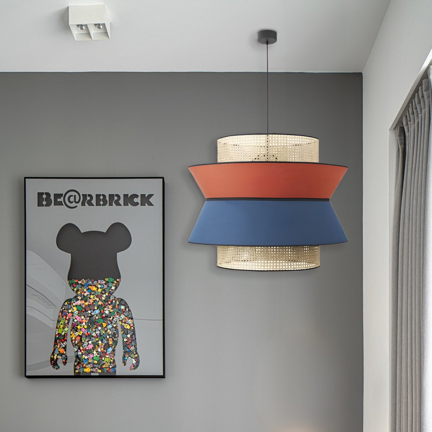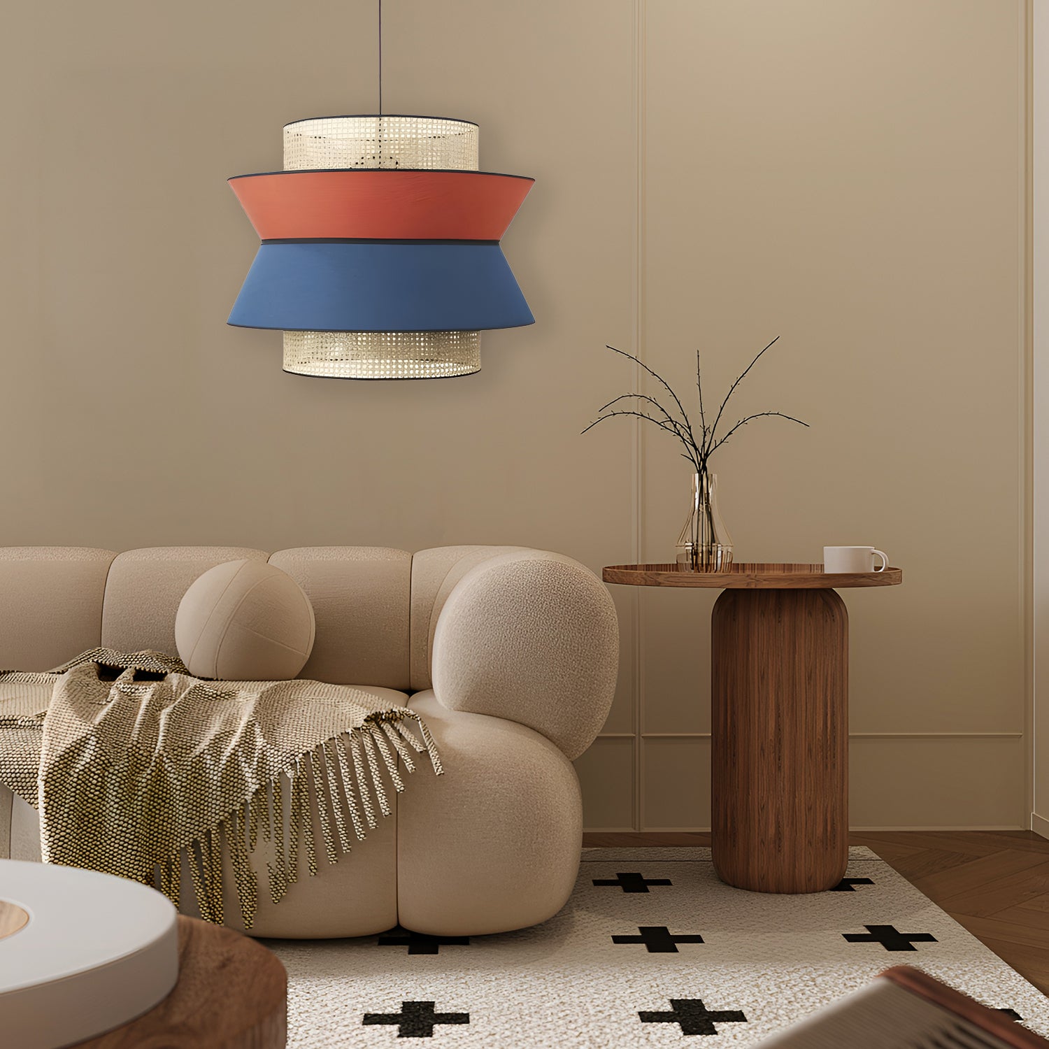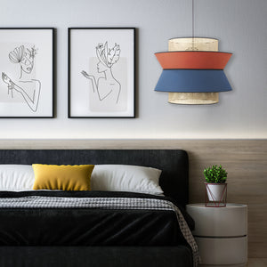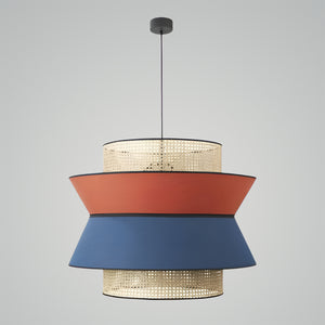 Introducing the 'Singapour XXL Suspended Lights' – a statement piece that artfully combines rustic charm with a modern aesthetic. Featuring a bold trio of layers, each with its own unique texture and color, this pendant light becomes the centerpiece of any room it graces. The upper tier's woven gold mesh diffuses light with a warm glow, while the vibrant terracotta and deep blue shades add a pop of sophisticated color. Ideal for those who appreciate handcrafted design with a contemporary twist, this chandelier is not just a source of light but a conversation starter, perfect for your dining area, living room, or creative space.