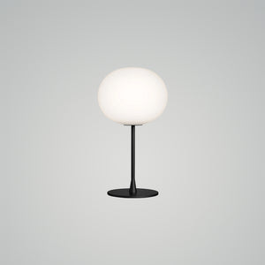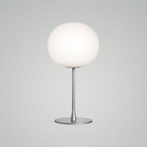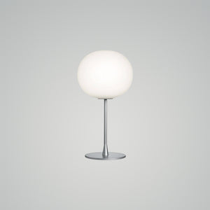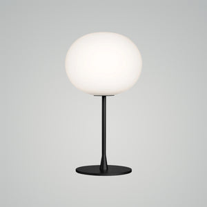 This table lamp is made of hand-blown opaline glass, providing diffused light, with a high-thickness steel base and stem painted in gray or black.