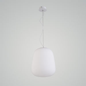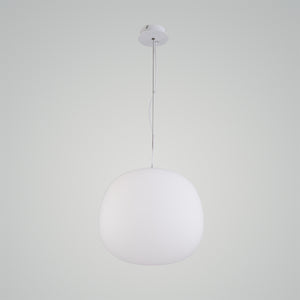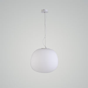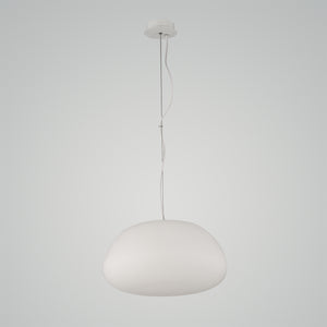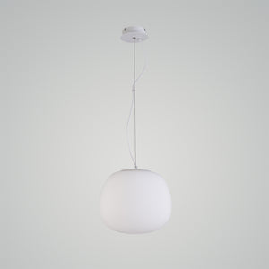 The pendant lamp features a white blown glass diffuser with a circular, flattened shape. It can be equipped with halogen, fluorescent, or integrated LED bulb options. This versatile lamp is perfect for use in home living areas as well as in public spaces like restaurants and bars.