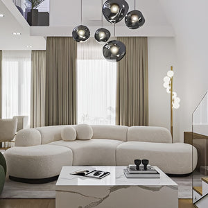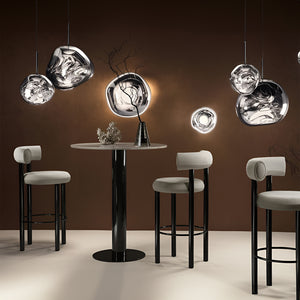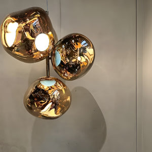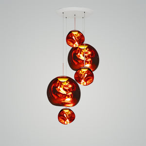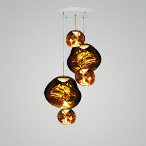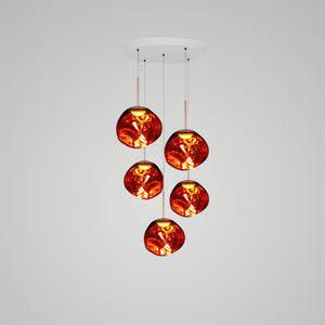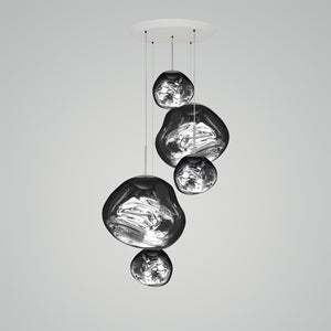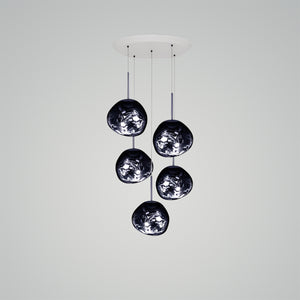 This extraordinary chandelier features five Melt Mini ceiling lights in a modern smoked finish. With our integrated LED modules, this ceiling light creates a mesmerizing molten heat-blown glass effect when on and a mirror effect when off. Made in Germany using high-tech manufacturing techniques, it creates a perfect molten sphere.