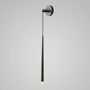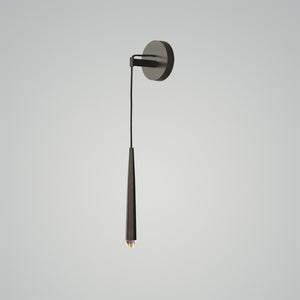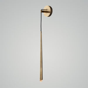 Inspired by 1960s French minimalist lighting, the elegant design features a solid brass form suspended from a slender black cord. An inset LED at the tip emits a warm, glowing light.
