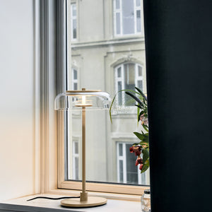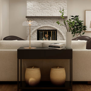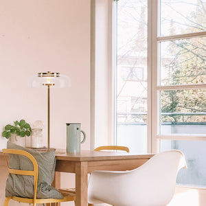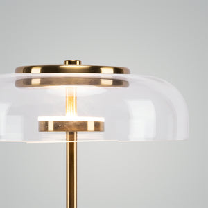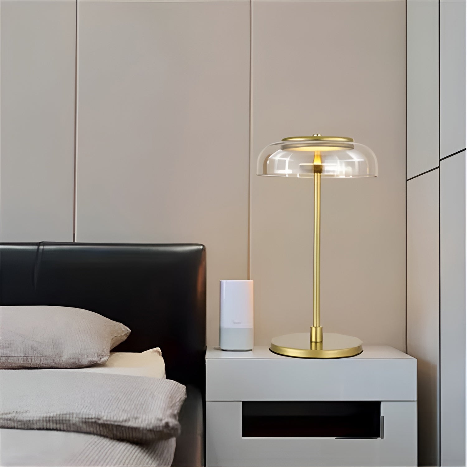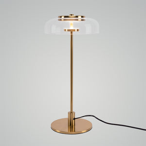 Introducing the Blossi Table Lamp , a masterpiece of illumination that combines classic elegance with modern design. The lamp's translucent glass bowl-shaped shade diffuses a soft, even light, perfect for creating a tranquil and inviting atmosphere in any room. Set upon a sleek golden stem, this lamp exudes luxury and sophistication, making it an ideal statement piece for your home or office. Whether it's for reading, working, or simply adding a touch of class to your space, the Aurora Glow Table Lamp is a beacon of style and functionality.