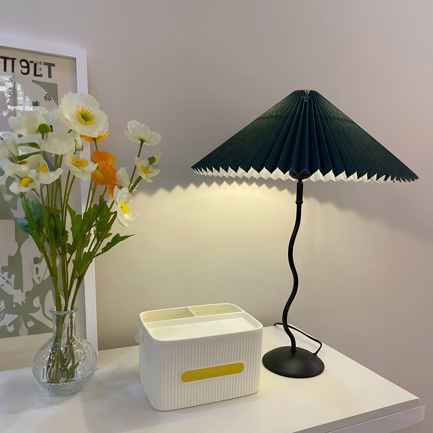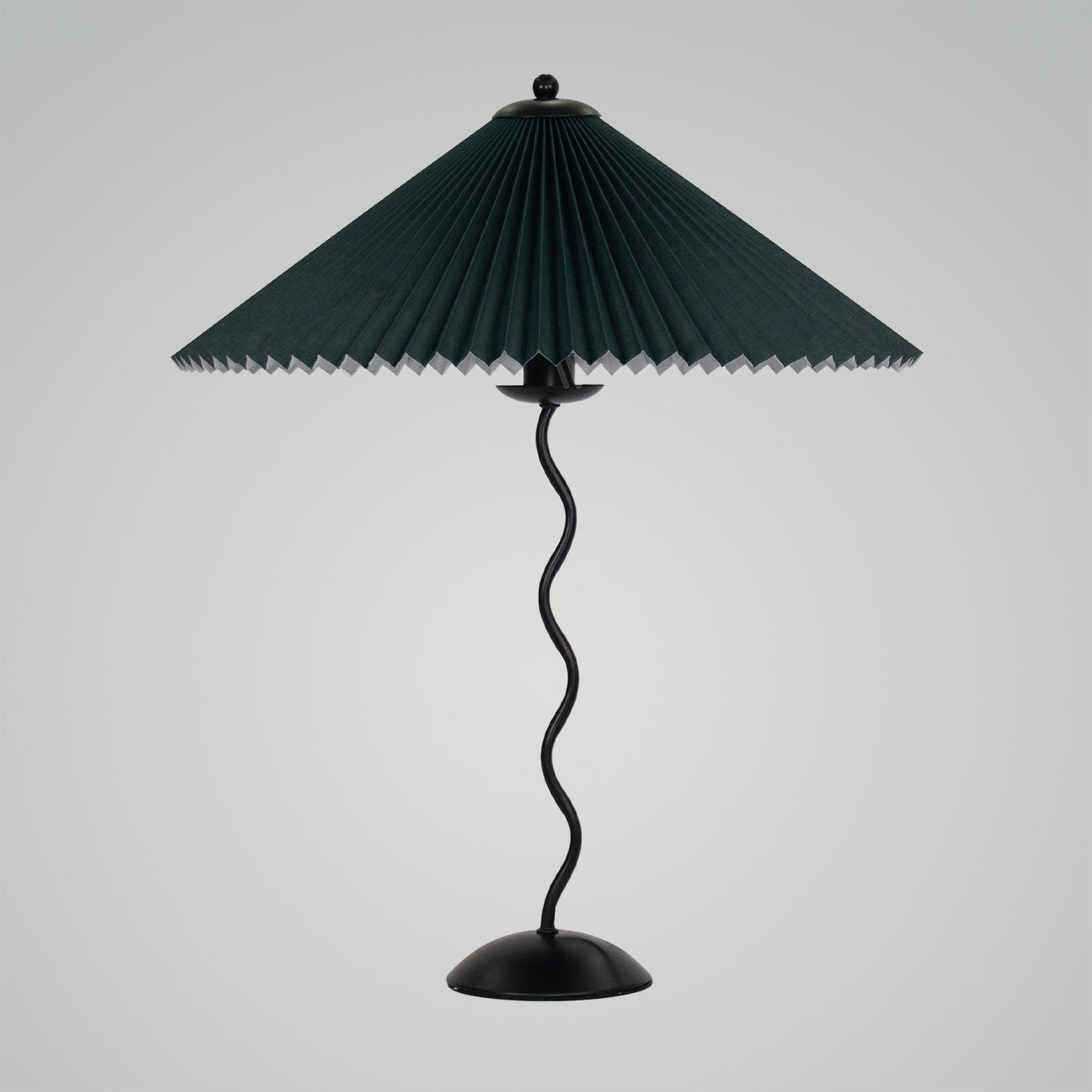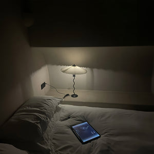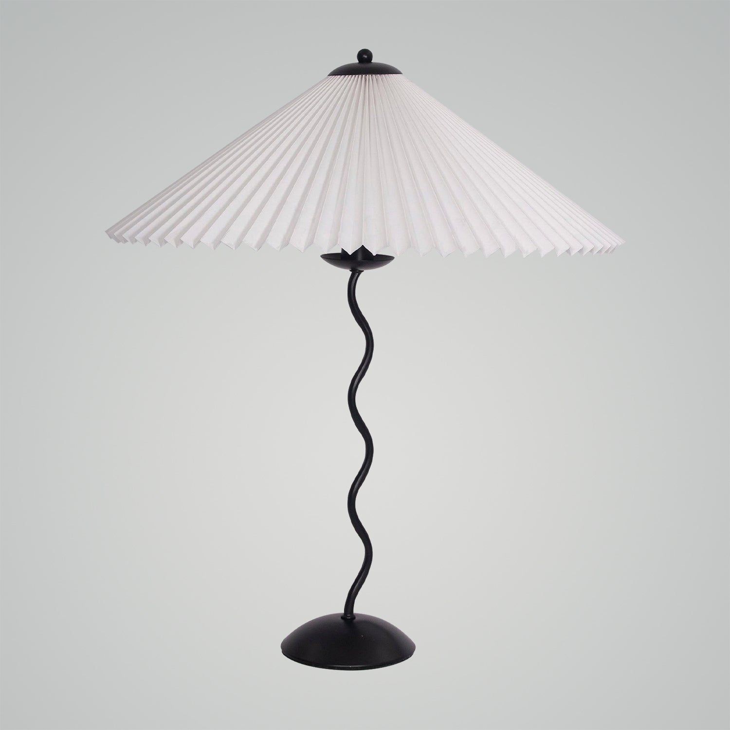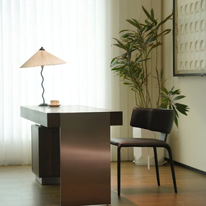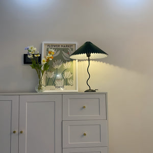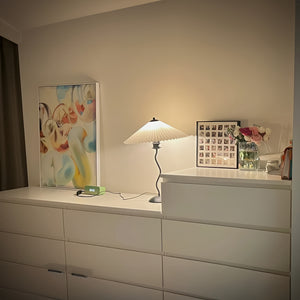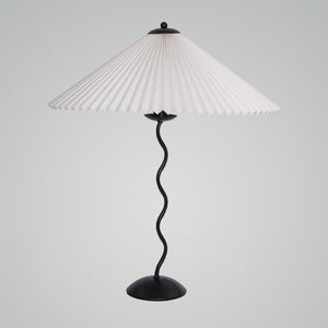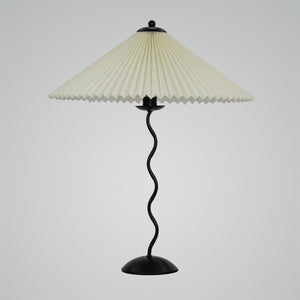 Discover the graceful curves of the 'Squiggle Table Lamp', a harmonious blend of wabi-sabi simplicity and modern design. Its unique curved pole stands as a testament to fluid form, leading to a classic pleated shade that diffuses light softly, creating a warm, inviting glow. Ideal for those who appreciate the beauty in subtlety, this lamp is perfect for reading nooks, bedside tables, or any space that calls for a touch of understated sophistication.
