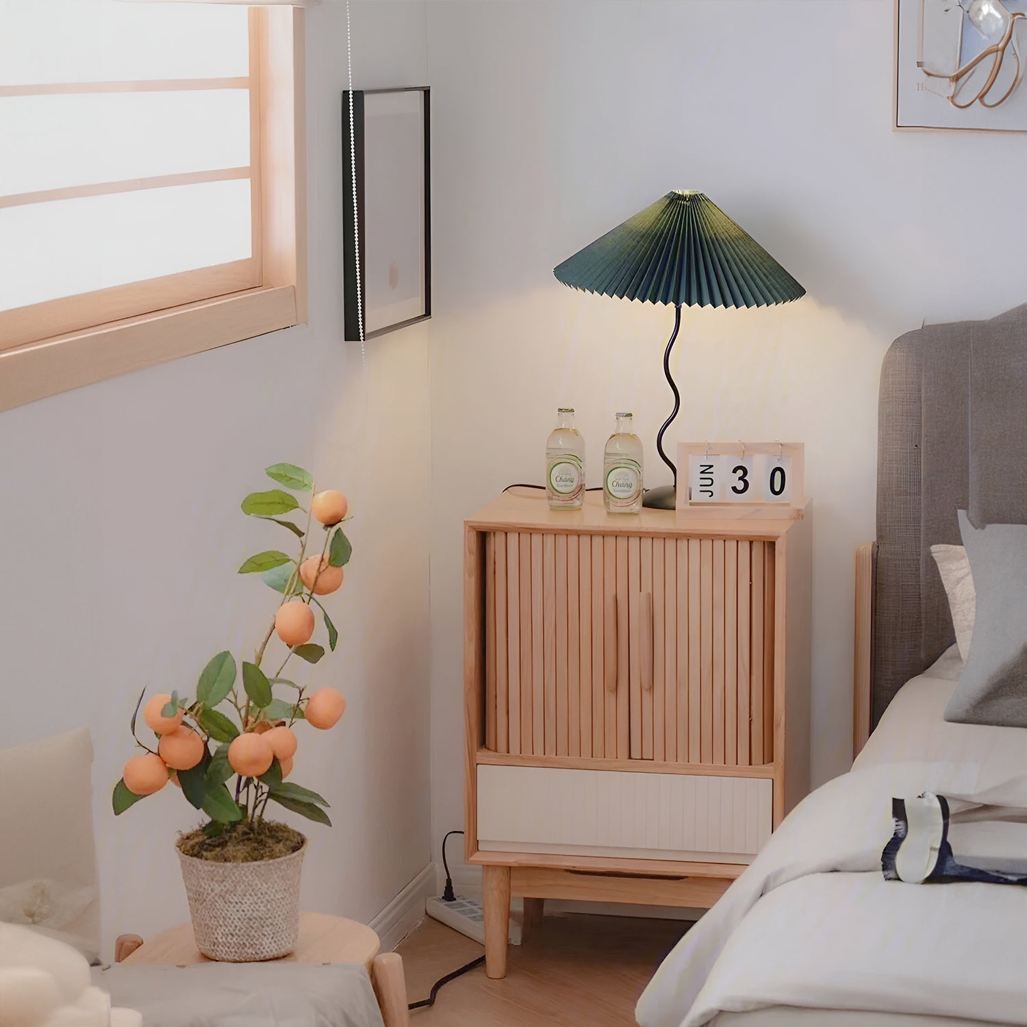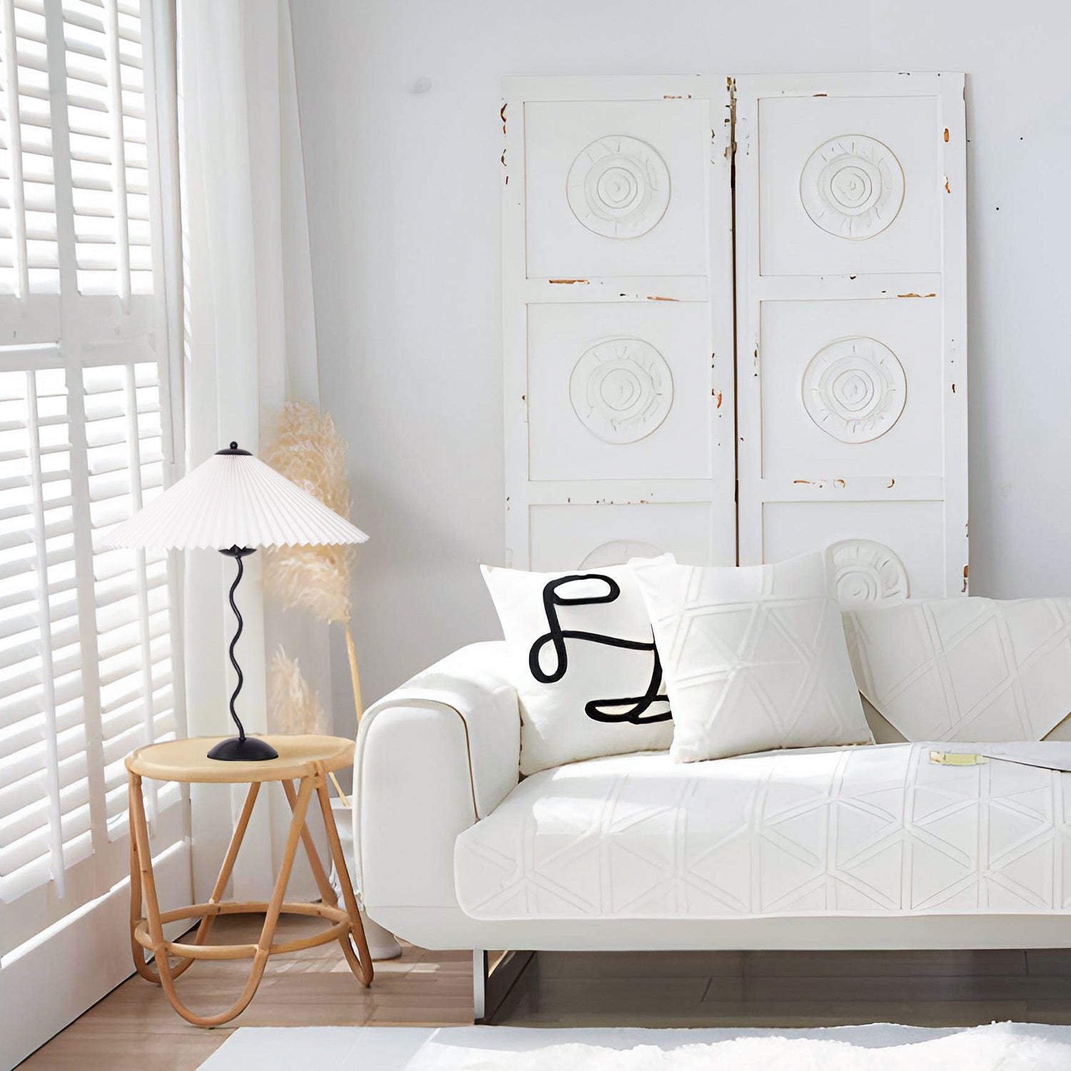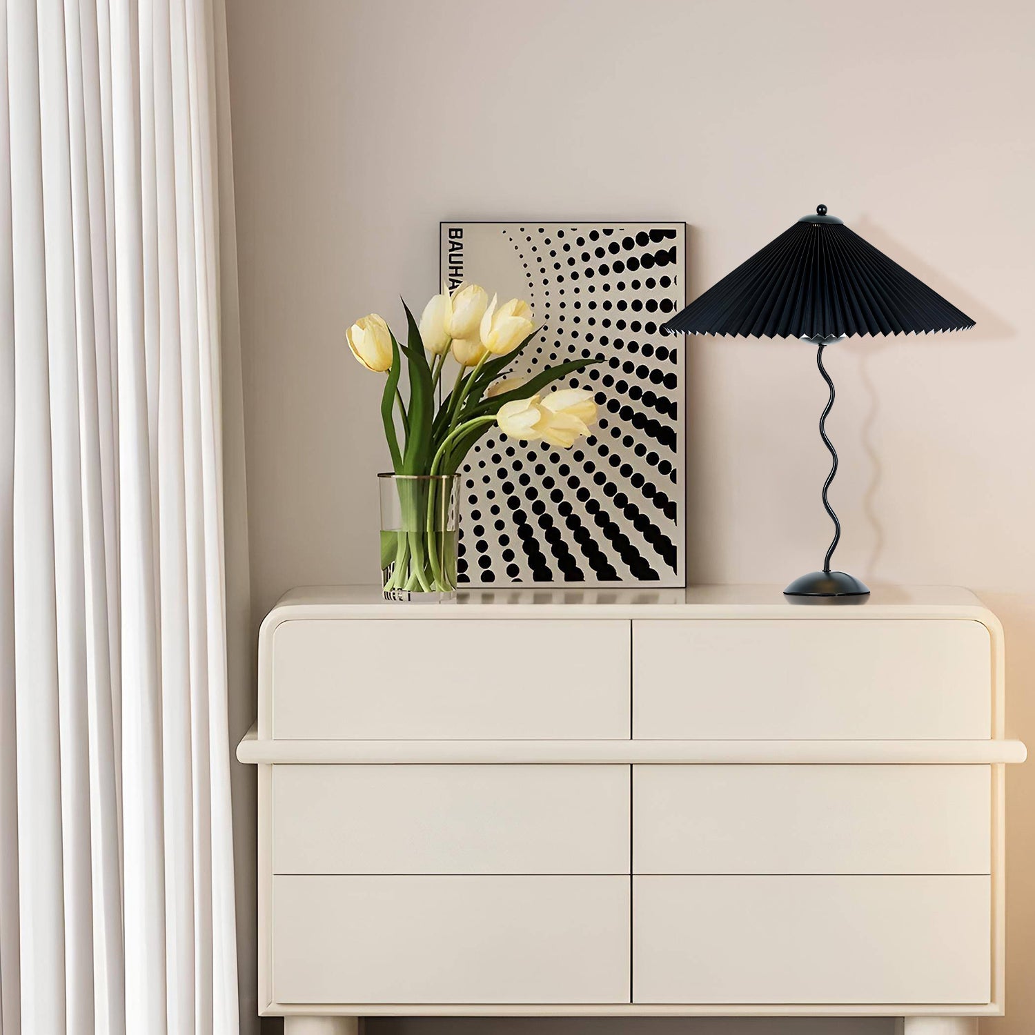 Discover the graceful curves of the 'Squiggle Table Lamp', a harmonious blend of wabi-sabi simplicity and modern design. Its unique curved pole stands as a testament to fluid form, leading to a classic pleated shade that diffuses light softly, creating a warm, inviting glow. Ideal for those who appreciate the beauty in subtlety, this lamp is perfect for reading nooks, bedside tables, or any space that calls for a touch of understated sophistication.