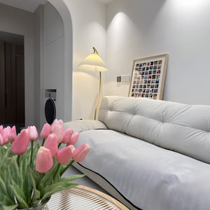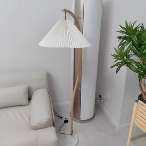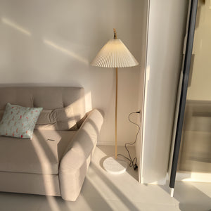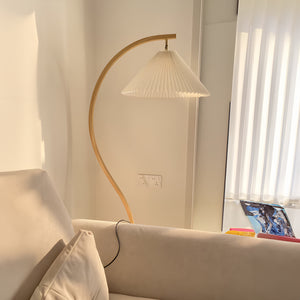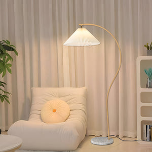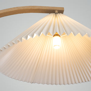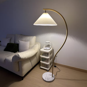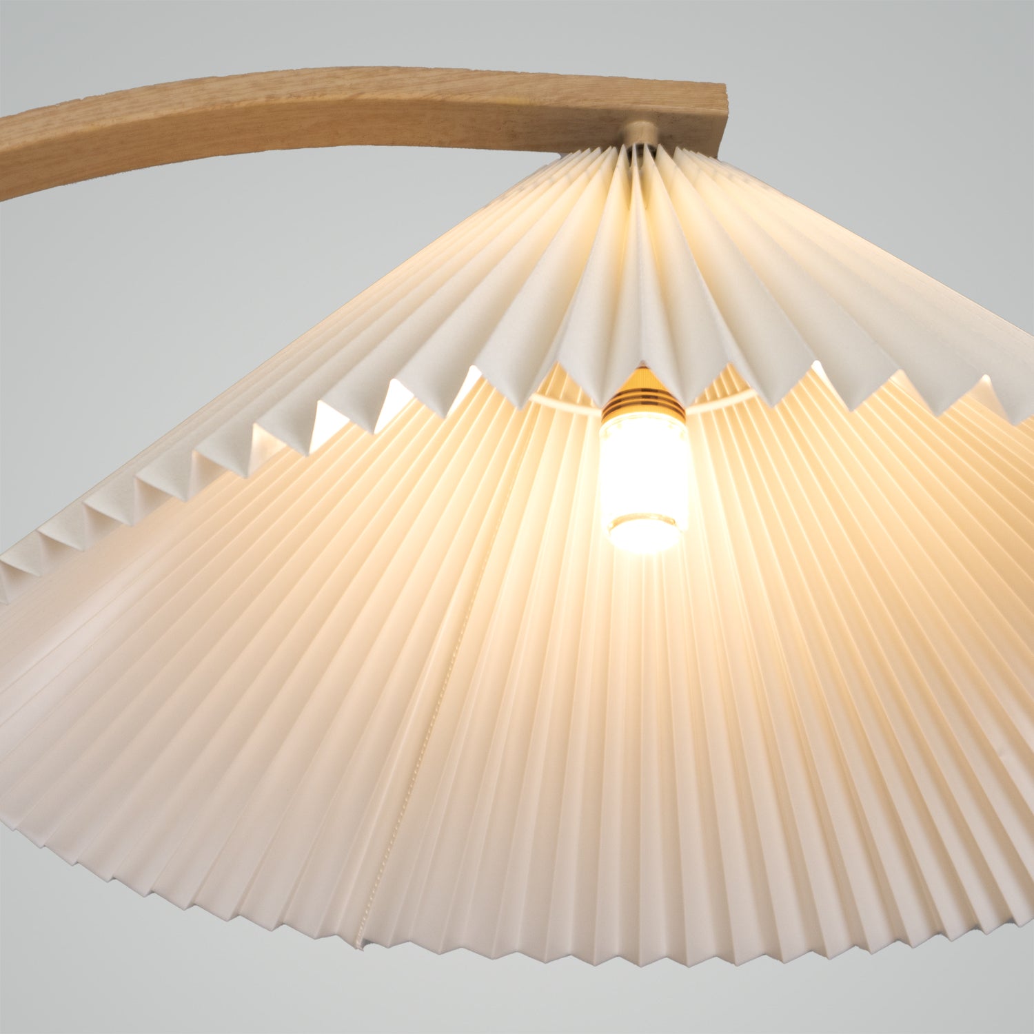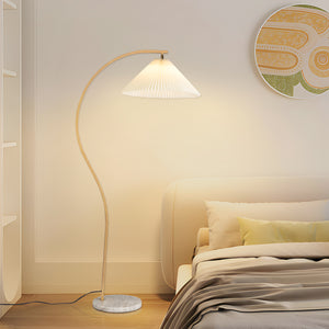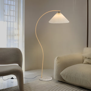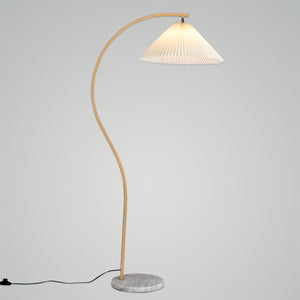 Discover the elegance of light with the 'Arched Floor Lamp', a harmonious blend of natural materials and flowing design. The lamp's slender wooden arch rises gracefully from a solid marble base, leading to a classic pleated shade that casts a warm, inviting glow. Ideal for adding a touch of organic sophistication to your living room or creating a cozy reading nook, this floor lamp stands as a testament to timeless style and serene illumination.