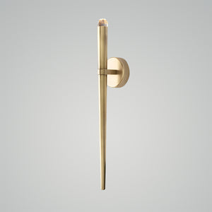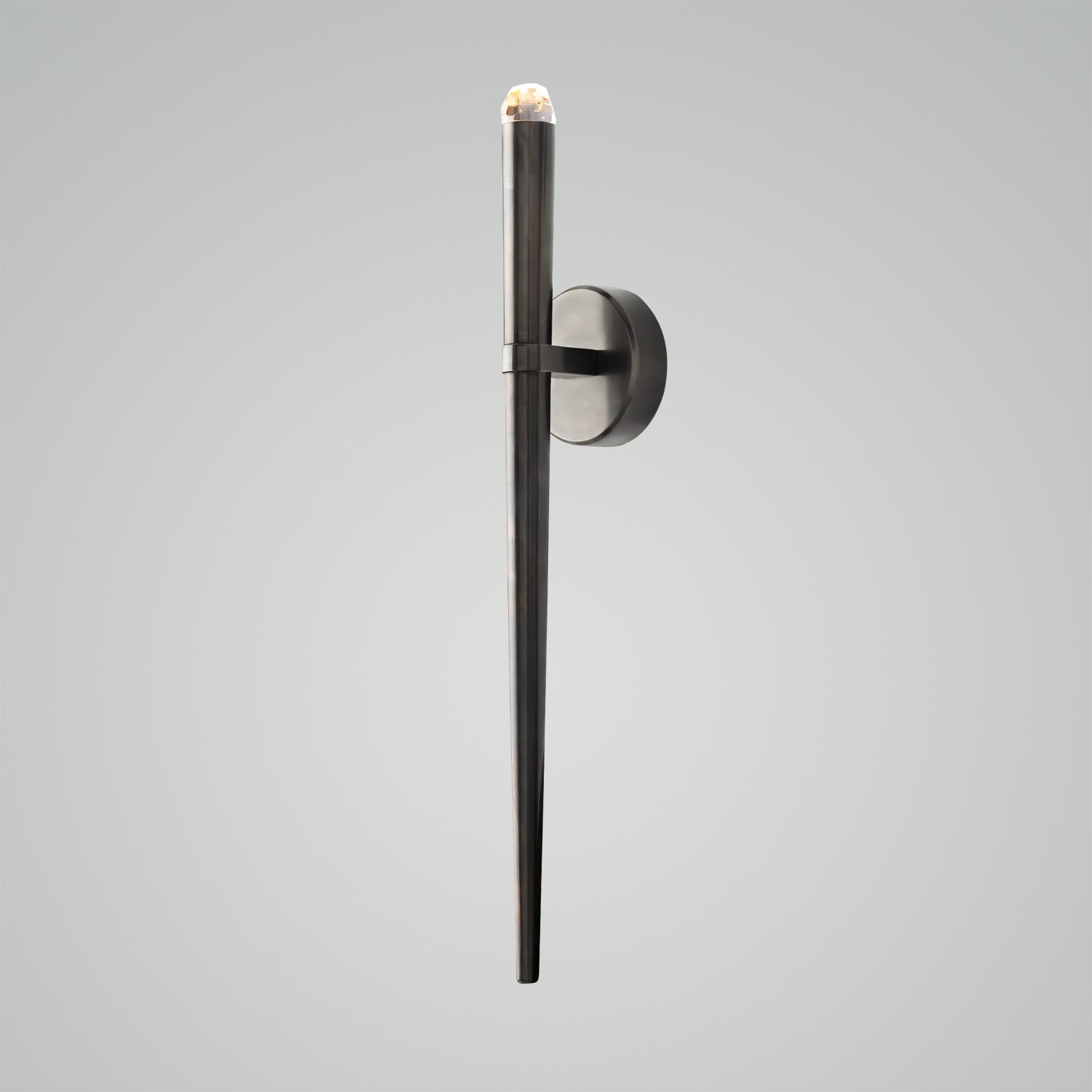 This elegant design by a lighting designer is inspired by the minimalist French lighting of the 1960s, featuring a tapered solid brass torch shape supported by a crisply chamfered backplate. An inset LED at the top provides warm, soft light.
