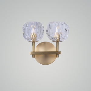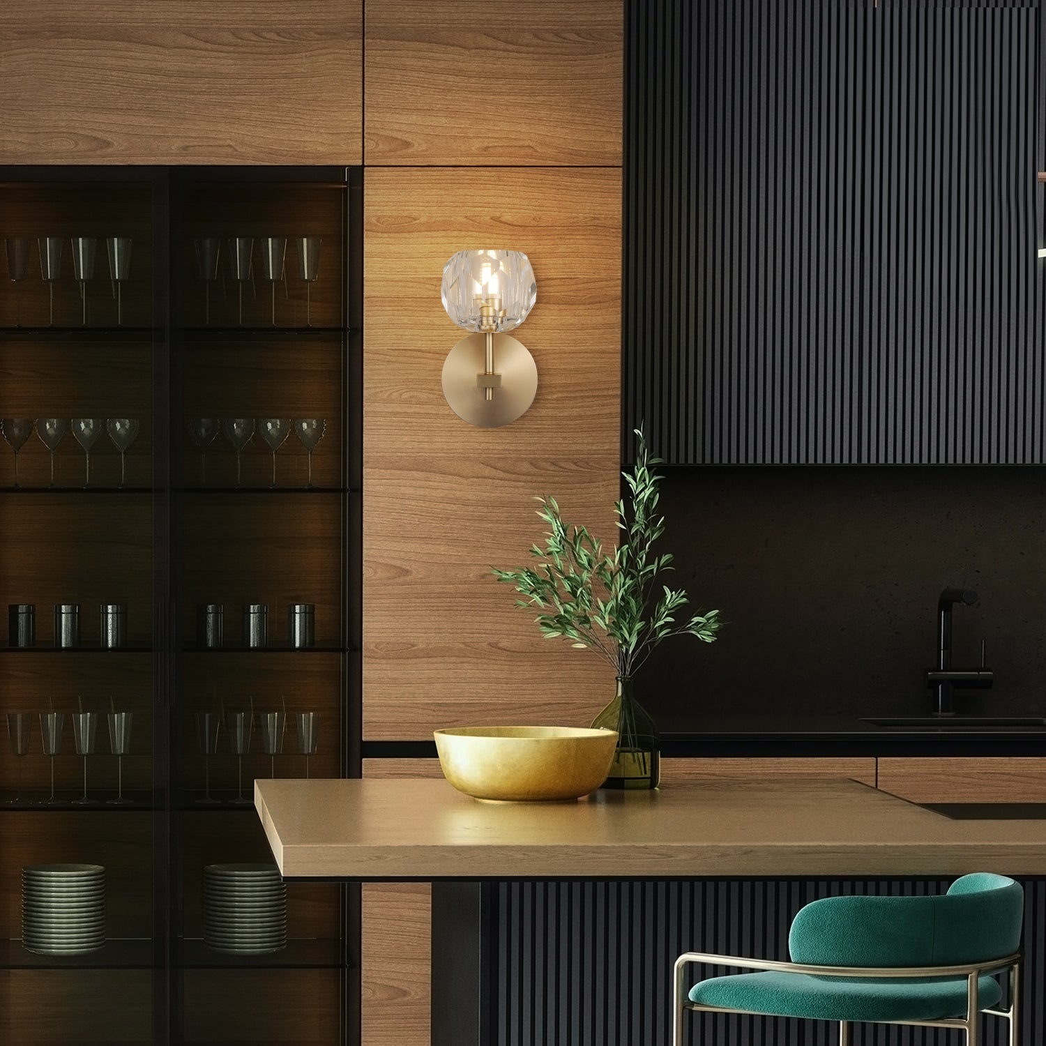 This sculptural fixture, crafted from solid brass and crystal glass, exemplifies a dedication to luxurious materials and exceptional craftsmanship. Inspired by the minimalist ethos of 1960s design, each finely faceted sphere is hand-ground and polished to beautifully reflect and refract light.