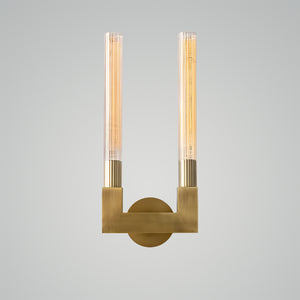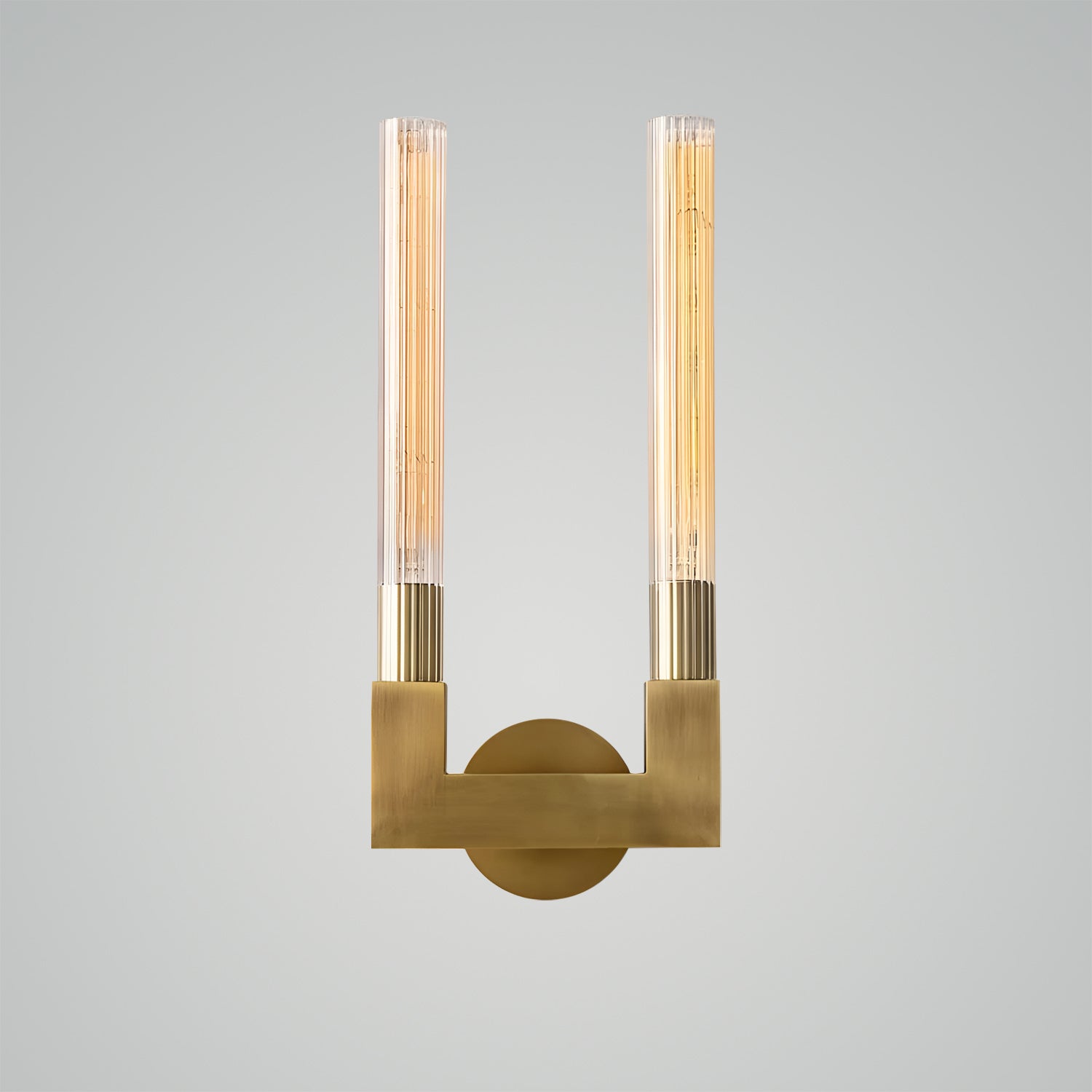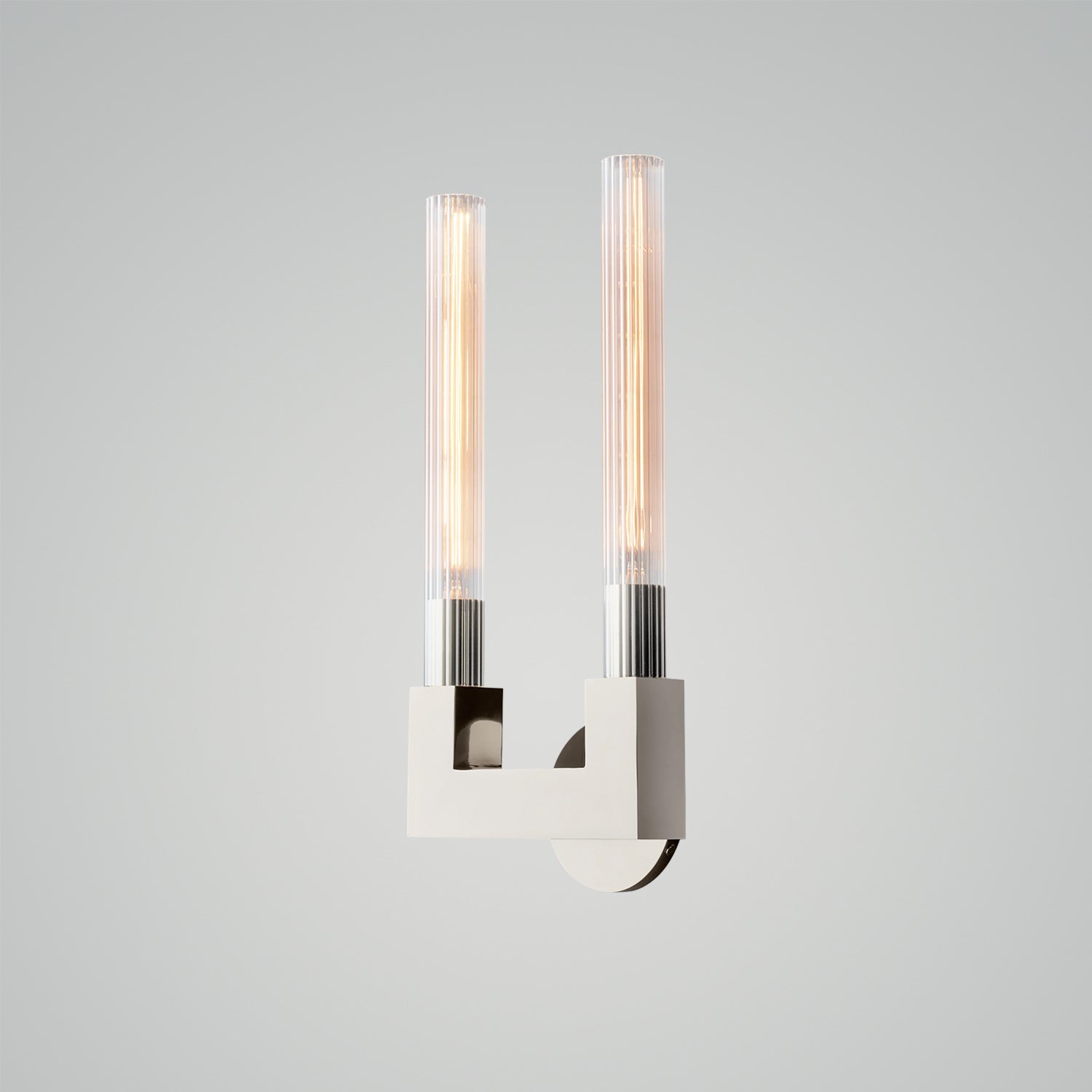 The form of a Beaux Arts candleholder is reinterpreted in solid brass. Defined by clean lines and sharp angles, the fixture's elegant ribbed-glass hurricanes showcase Edison filament bulbs, shimmering like candles within.