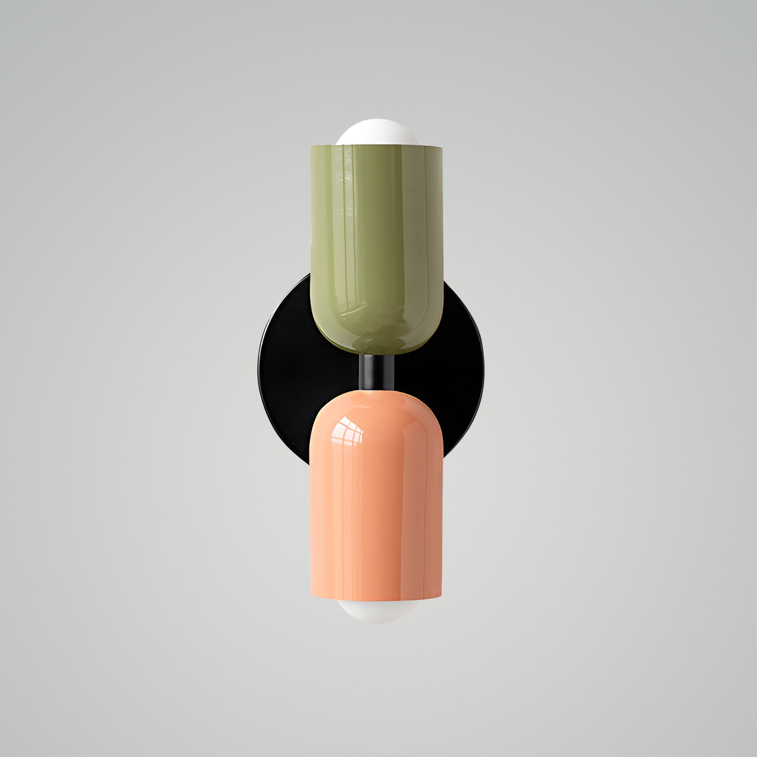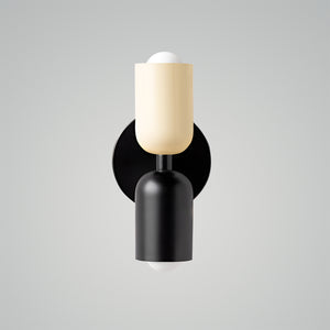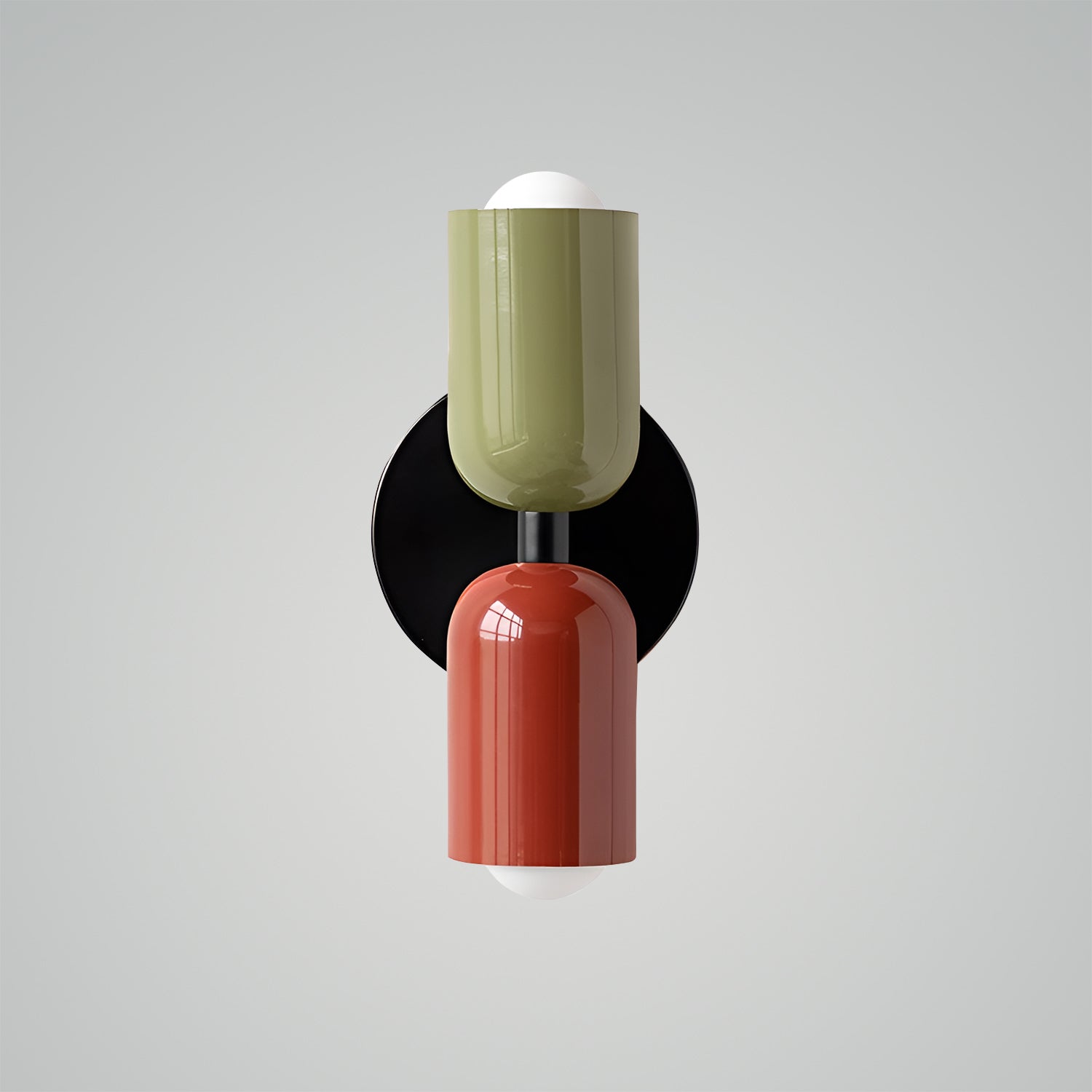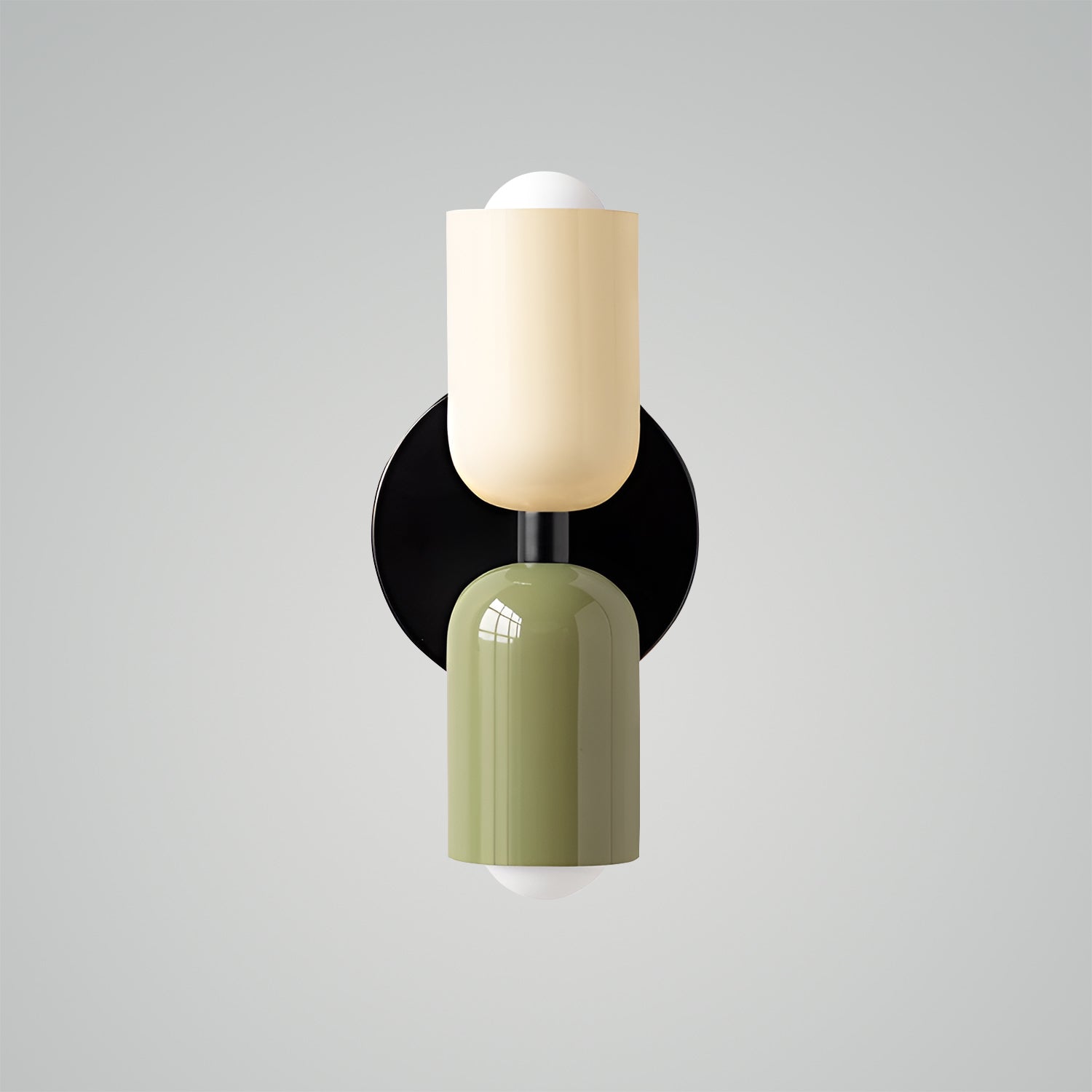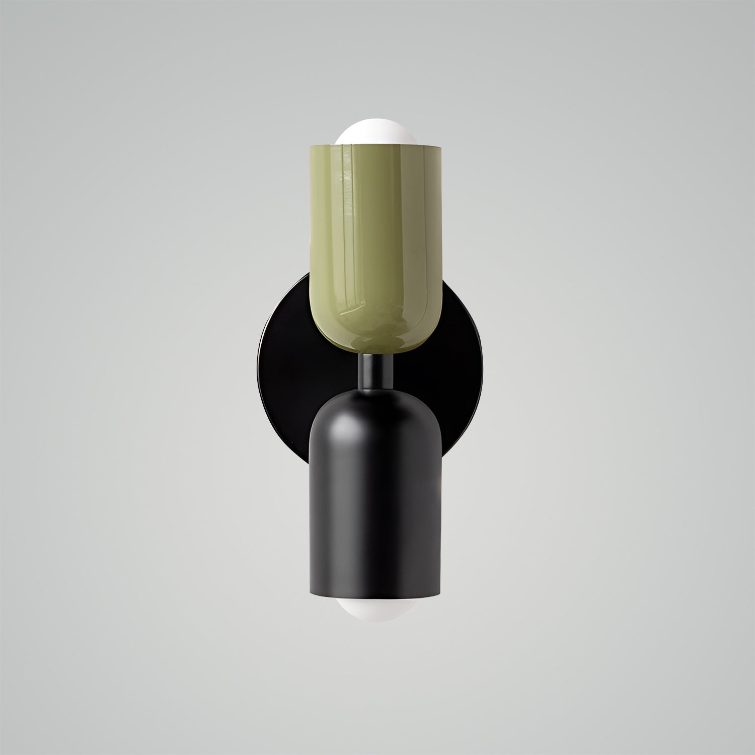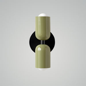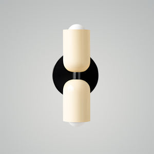 The Couleur Double-Head Wall Lamp is an artistic expression of balance and beauty. This unique fixture features dual cylindrical shades, one resting atop the other, creating an intriguing play of light and form. The contrasting colors, a soothing olive and a soft cream, are set against a bold black backdrop, making this sconce a striking visual statement. This piece is perfect for adding a touch of sophistication and modern design to your walls, with a warm, inviting light that is ideal for hallways, bedrooms, or living spaces. The Bi-Form Shadows Wall Sconce is a testament to contemporary style, offering an elegant yet functional element to your decor.