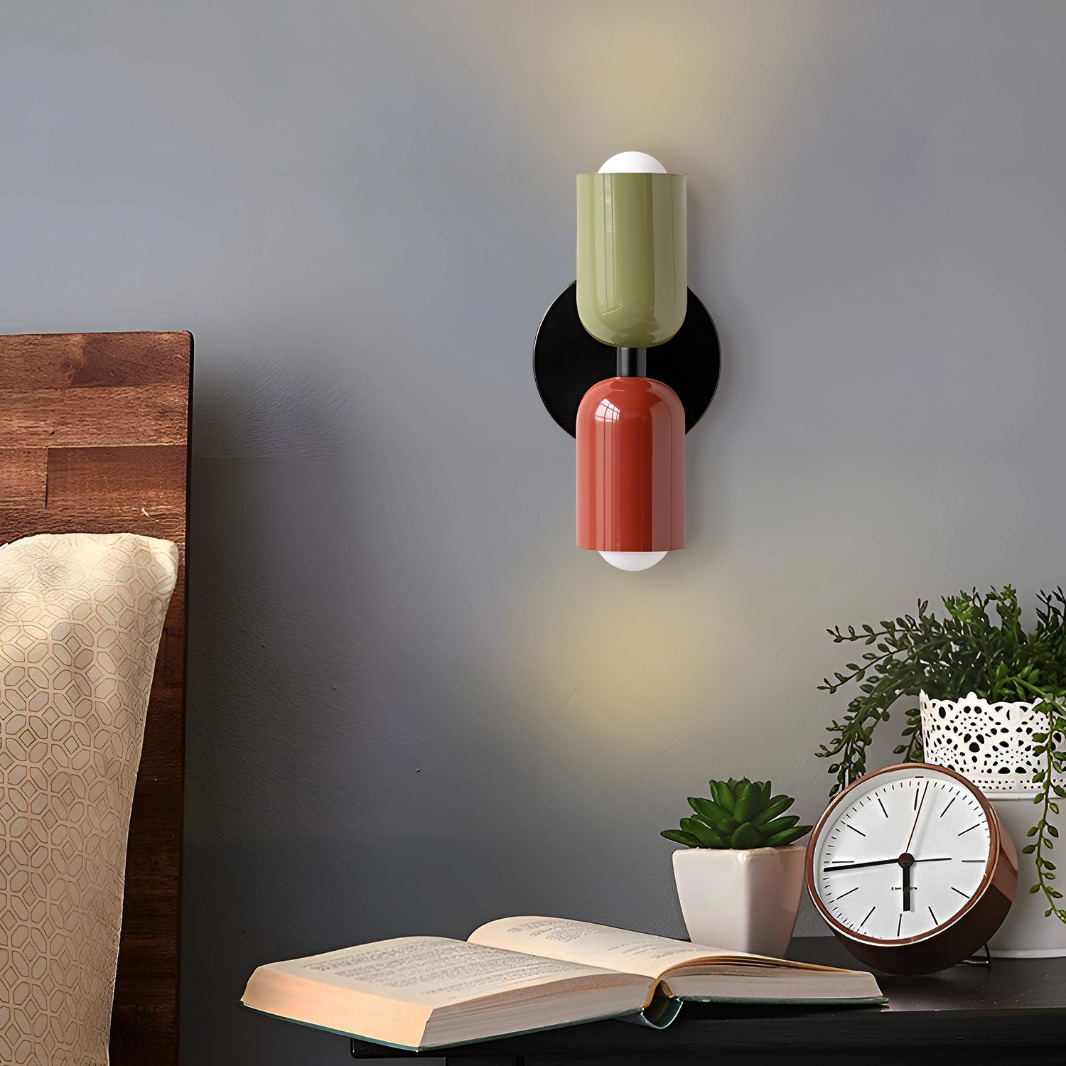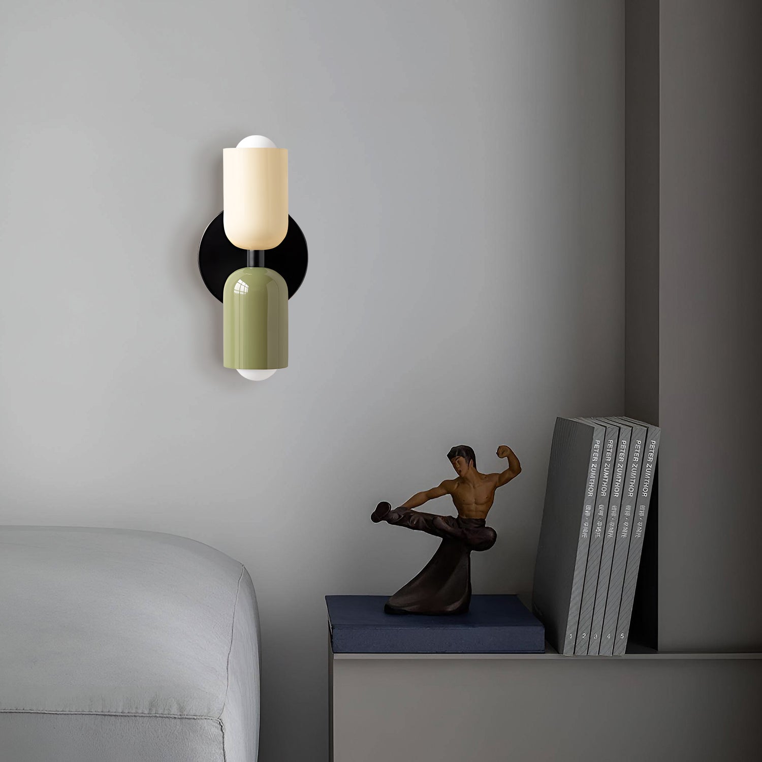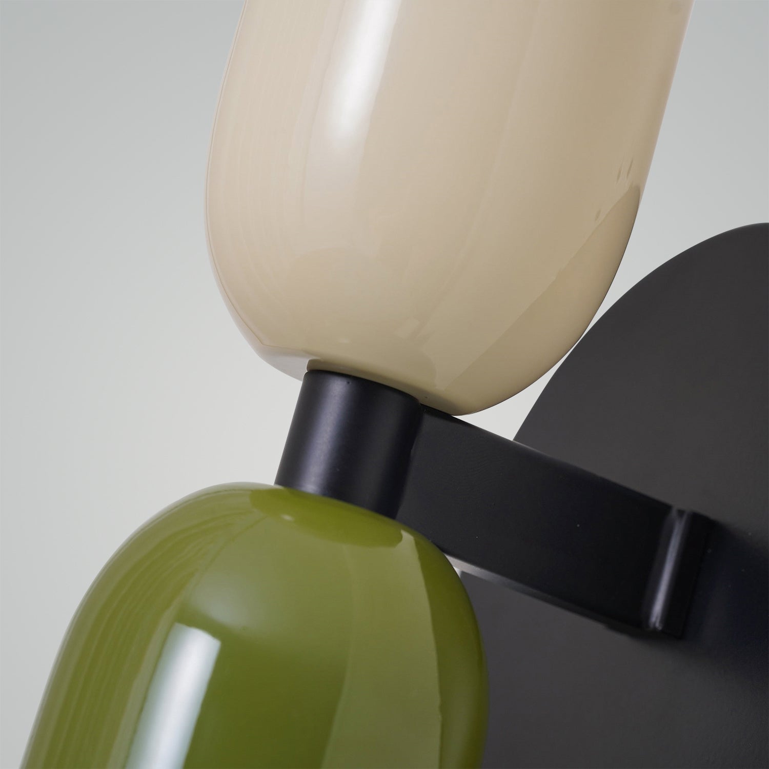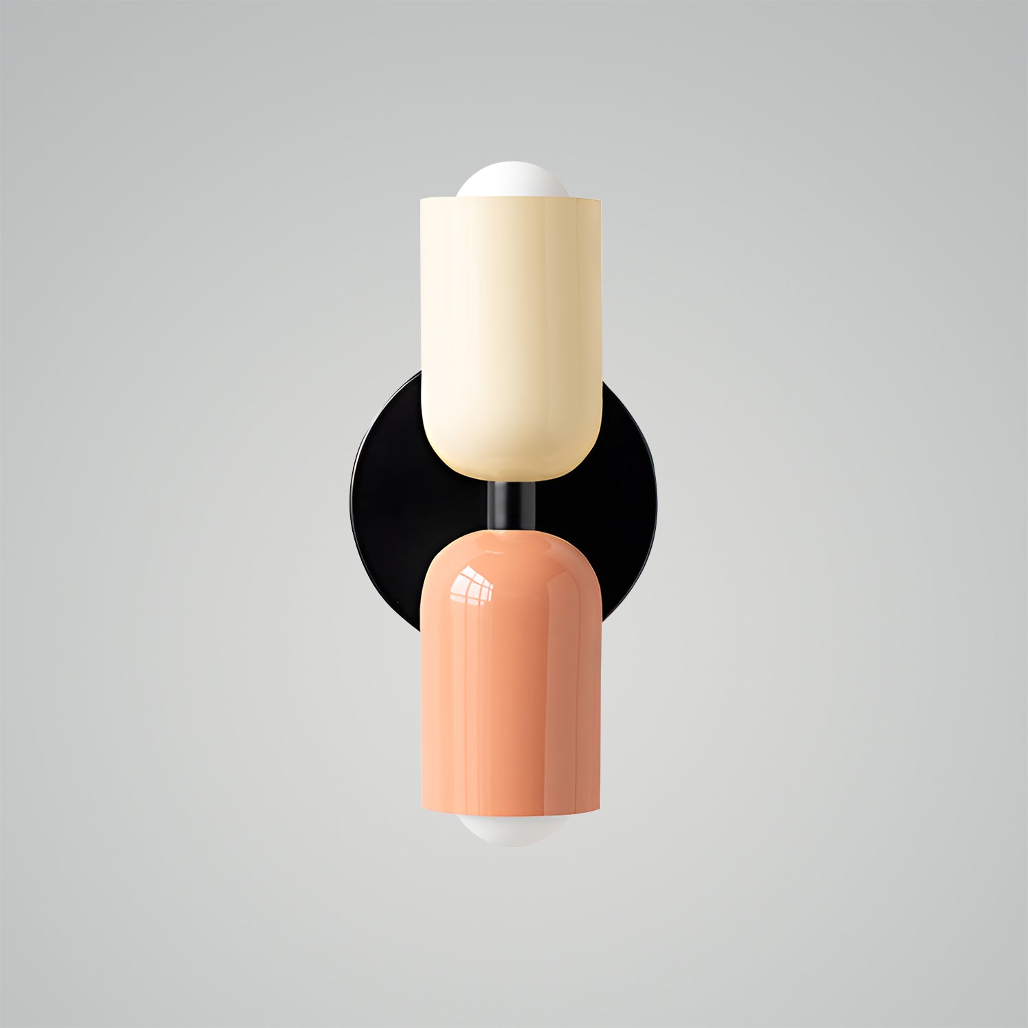 The Couleur Double-Head Wall Lamp is an artistic expression of balance and beauty. This unique fixture features dual cylindrical shades, one resting atop the other, creating an intriguing play of light and form. The contrasting colors, a soothing olive and a soft cream, are set against a bold black backdrop, making this sconce a striking visual statement. This piece is perfect for adding a touch of sophistication and modern design to your walls, with a warm, inviting light that is ideal for hallways, bedrooms, or living spaces. The Bi-Form Shadows Wall Sconce is a testament to contemporary style, offering an elegant yet functional element to your decor.