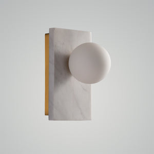 Metal wall lamp with a marble base and opal glass shade, featuring white marble. The metal parts have a matte brass finish. Includes a replaceable bulb.