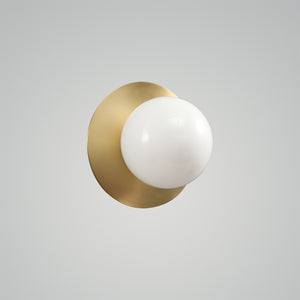 Liila 1 is a simple and minimalist wall and ceiling lamp suitable for both small and large homes. It features a round backplate in golden metal that supports an opal white glass globe, which softly diffuses light. Liila 1 Small can be used as a ceiling light in the corners of a dining room, complementing the main lighting typically centered above the dining table. All Liila 1 wall and ceiling lamps are IP44 rated and approved for bathroom use.