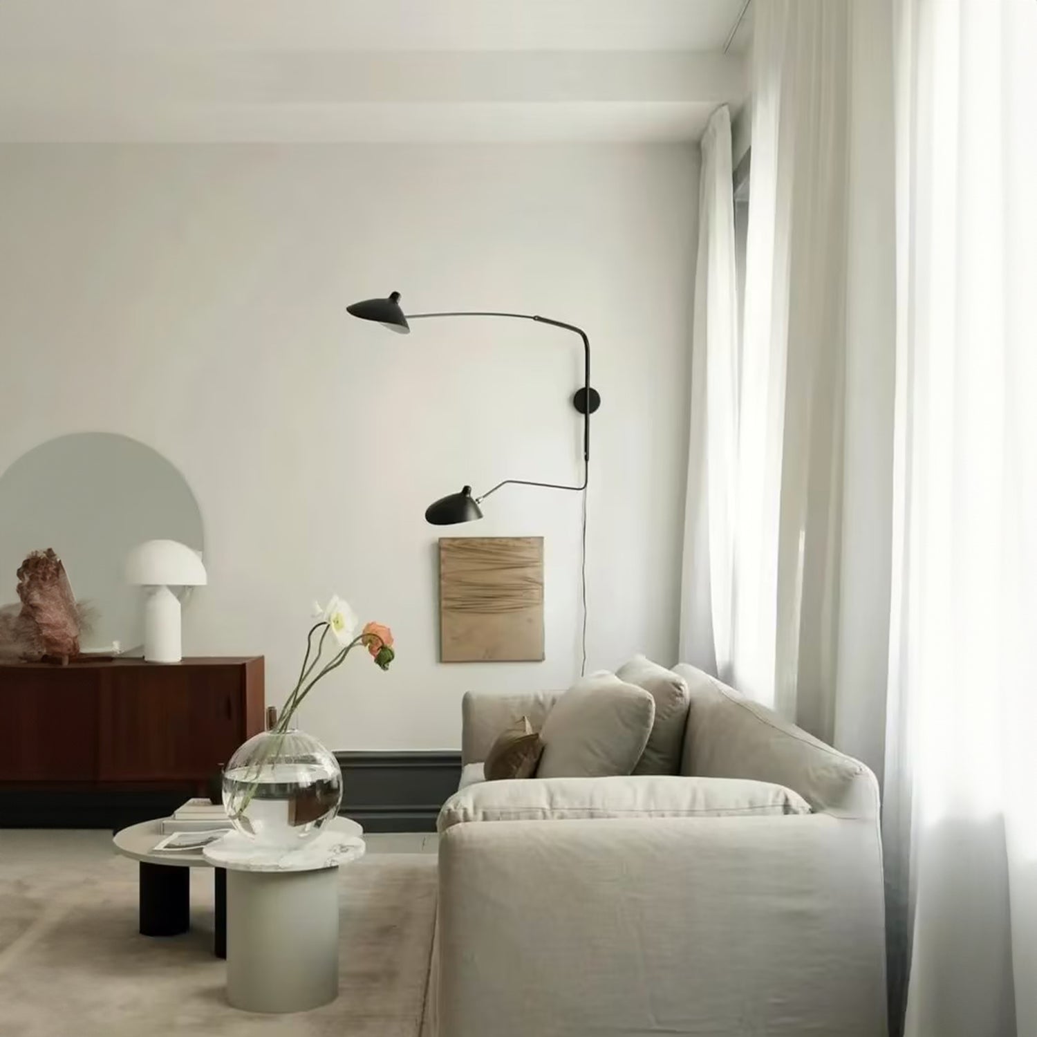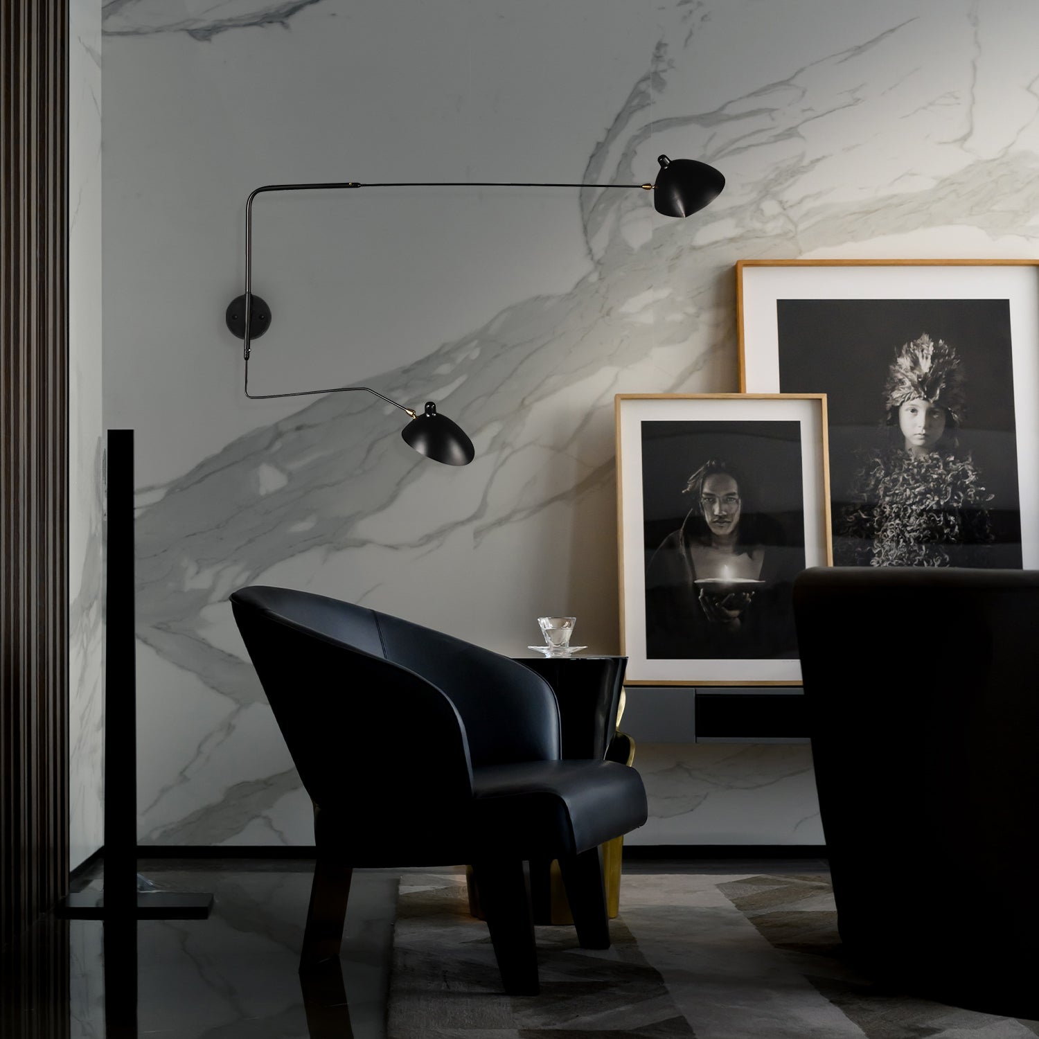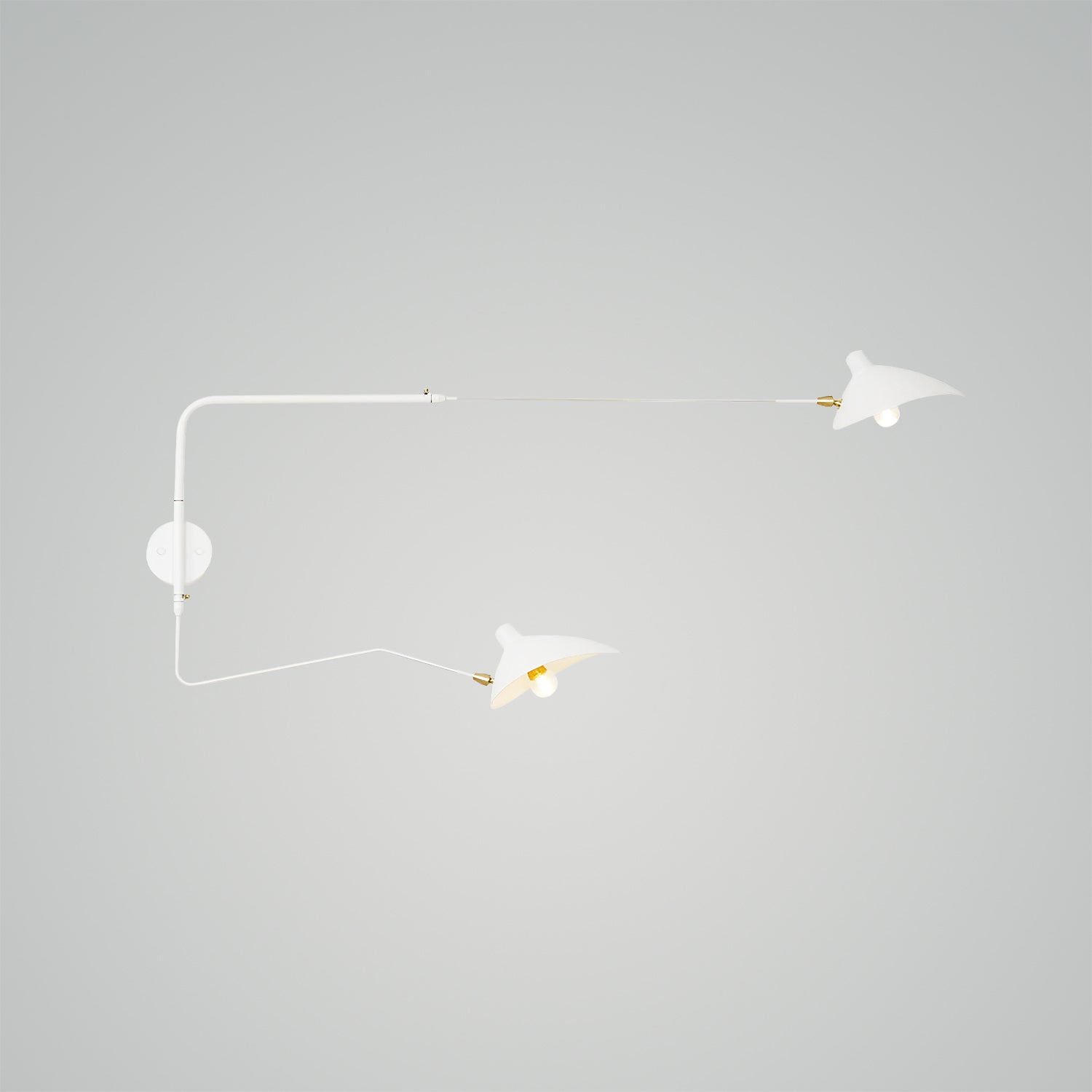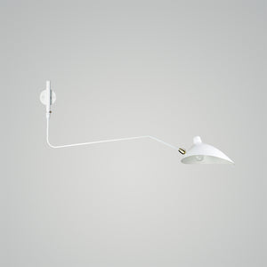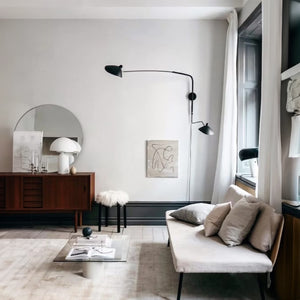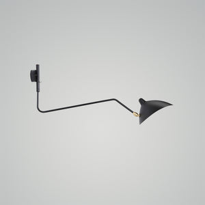 Introducing the 'Serge Mouille Wall Sconce', a fusion of modern art and functionality. Its distinctive, angular arm and classic black and brass finish make it a striking addition to any room. Designed to provide directed light without overwhelming the space, this wall sconce is perfect for reading nooks, bedside illumination, or adding a touch of drama to your hallway. Embrace the balance of style and practicality with this chic, contemporary lighting choice.