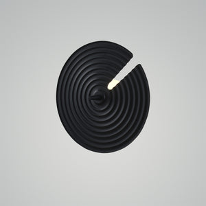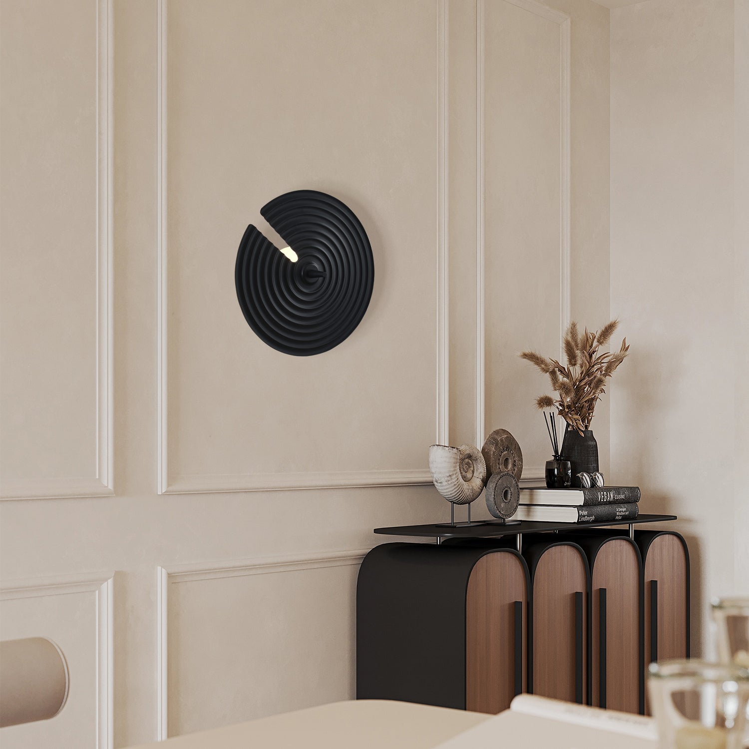 The wall light features an aluminum stamped lampshade with a central component housing a neodymium magnet. The exterior is finished in metallic copper, while the interior of the lampshade is coated with matte white lacquer. The lampshade is made of smooth milky white PE and includes an injection-molded polycarbonate support, also finished in metallic copper. A spherical neodymium magnet is embedded within the glass lampshade. The back plate of the wall light is made of die-cast metal, and the wall-mounting base is crafted from stamped steel.