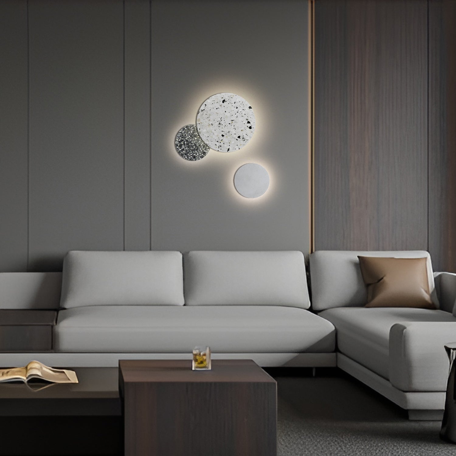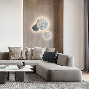 Embrace the allure of modern design with the 'Terrazzo Wall Lamp,' a stunning addition to any contemporary home. This lamp features a chic terrazzo facade with a blend of deep blue and muted tones, creating a captivating mosaic effect that is both artistic and sophisticated. The circular design exudes simplicity and elegance, while the unique texture adds depth and interest to your walls. Ideal for creating an ambient glow in hallways, living spaces, or bedrooms, this lamp is a subtle yet striking statement piece. Illuminate your space with the stylish and serene Azure Mosaic Disc Wall Lamp.