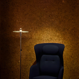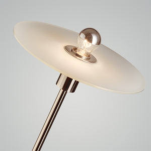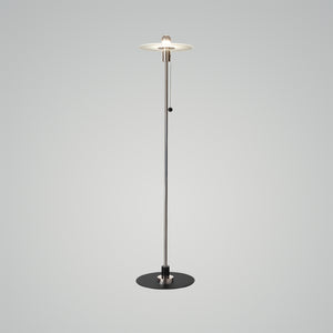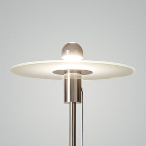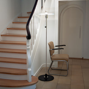The light source itself is a unique design feature—a bare incandescent bulb with a mirrored dome, which had just been invented at the time. The light is directed downward, making the light source appear dim. The light is absorbed and refracted by etched frosted glass, making it seem like a shiny layer floating above a thin nickel-plated metal tube. This lamp was showcased as an example of functional design in Issue 7 of the Bauhaus book, published in 1925. The only original model was exhibited in an experimental house called “Am Horn,” but unfortunately, it has since been lost.