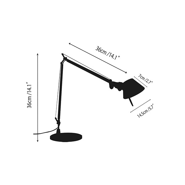 Tolomeo Mini is a table lamp designed by two designers. The base and cantilevered arms are made of polished aluminum; the diffuser is made of matte anodized aluminum; the joints and supports are also made of polished aluminum. It features a spring balancing system.