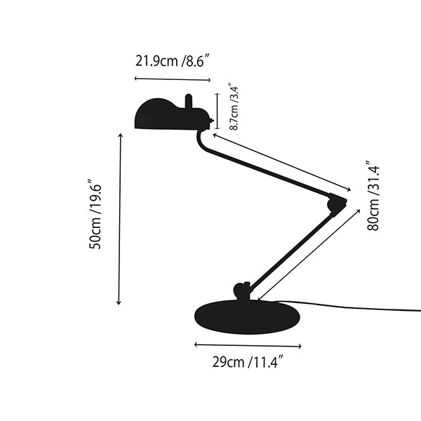 This is a table lamp with a directional metal shell, coated in bright white, black, green, chrome, or iconic red finishes. The inner shell is painted white. The handle is made of black heat-resistant material. It features a metal articulated arm with joints made of black plastic.