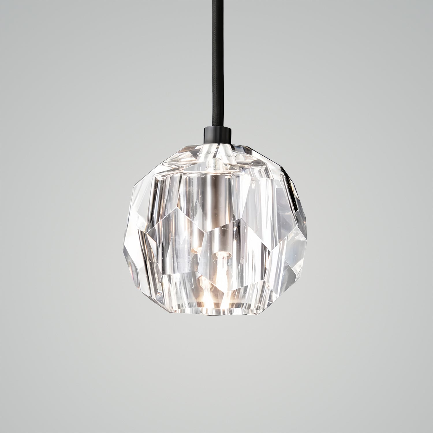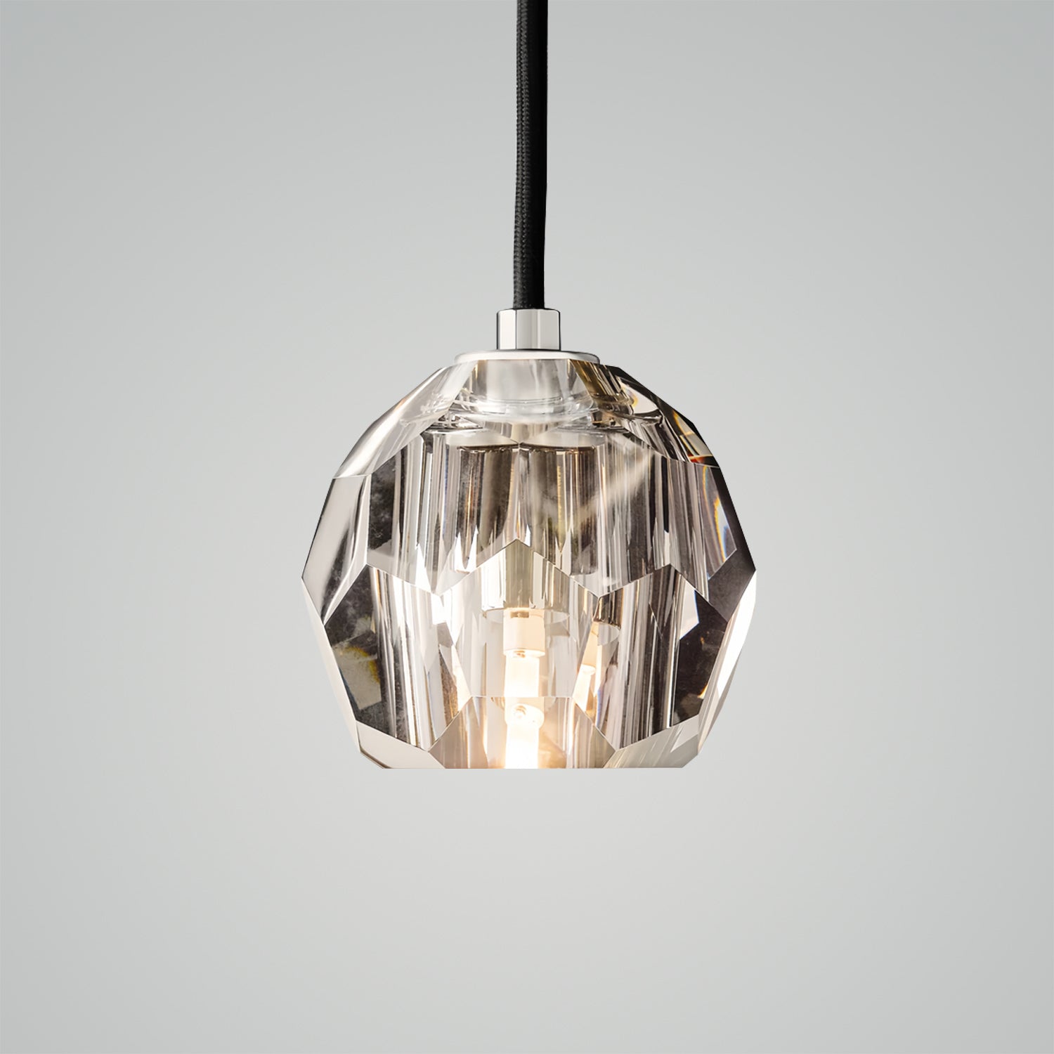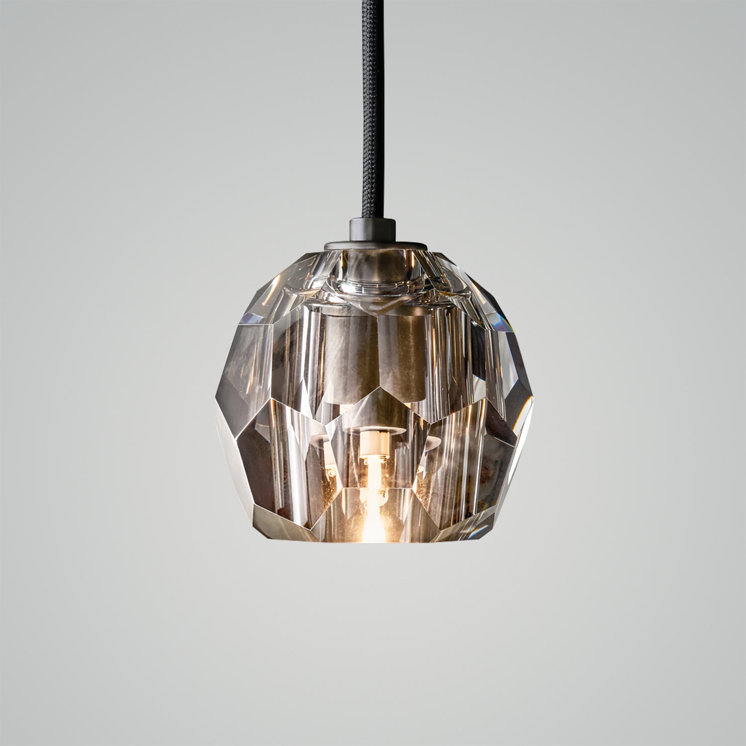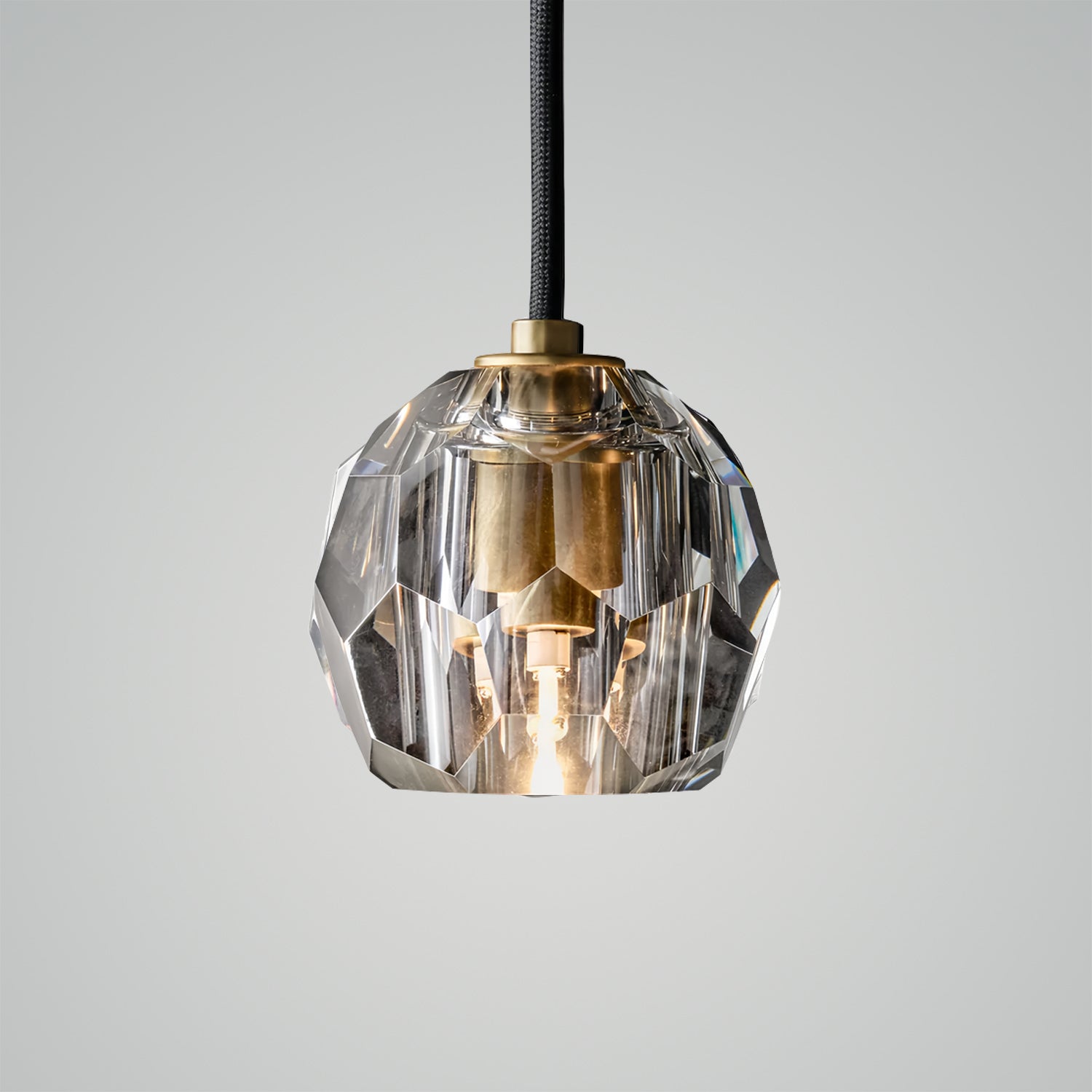This sculptural fixture is crafted from solid brass and crystal glass, embodying a passion for luxurious materials and superior craftsmanship. Each finely faceted sphere is hand-ground and polished to reflect and refract light, evoking the minimalist spirit of 1960s design.